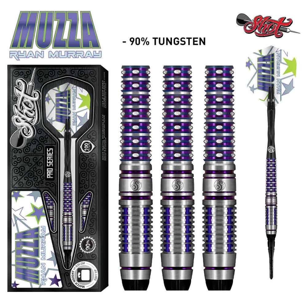 El dardos se compone por 1 ser de 3 cuerpos Shot Muzza Ryan Murray con punta de metal, 1 ser de 3 cañas, 1 set de 3 plumas y 1 set de 3 puntas