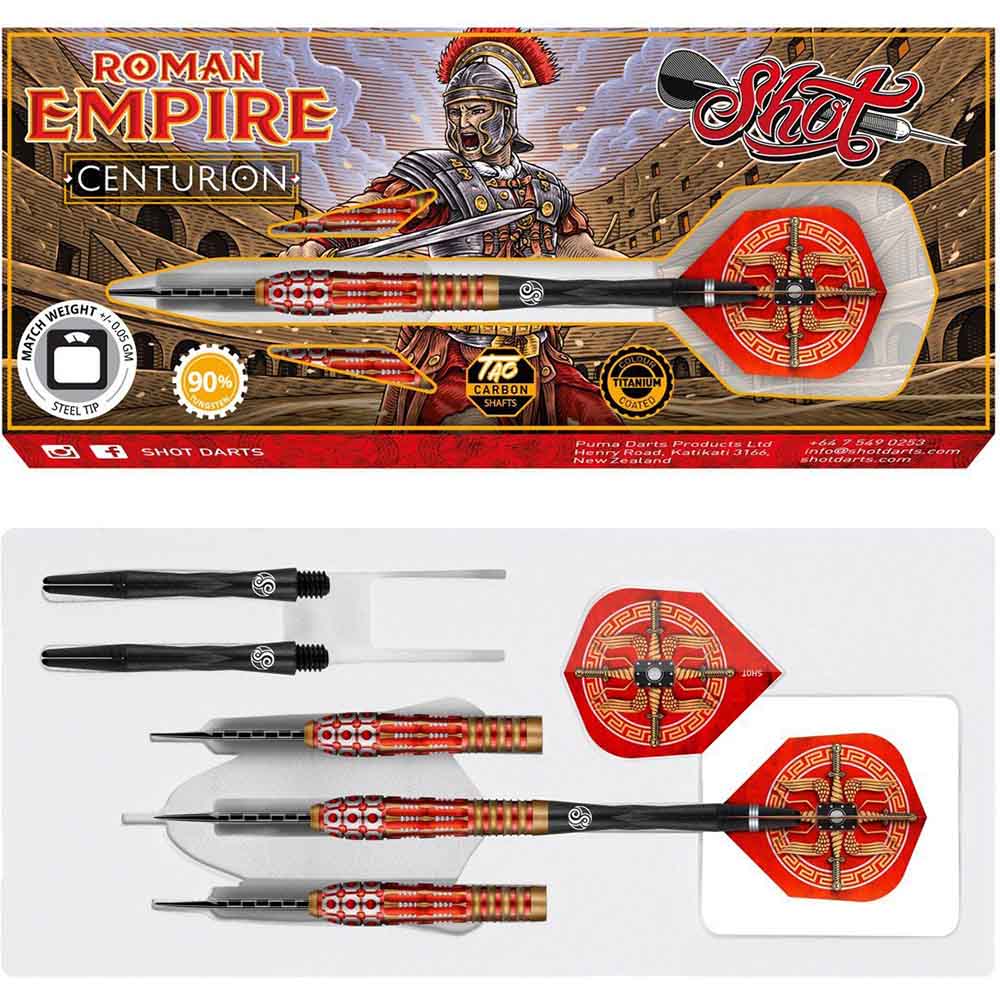 El dardos se compone por 1 ser de 3 cuerpos Roman Empire Centurion con punta de metal, 1 ser de 3 cañas y 1 set de 3 plumas.