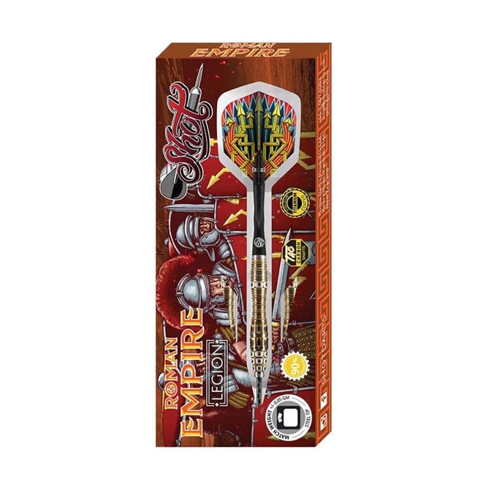 El dardos se compone por 1 ser de 3 cuerpos Roman Empire Legion con punta de metal, 1 ser de 3 cañas y 1 set de 3 plumas.
