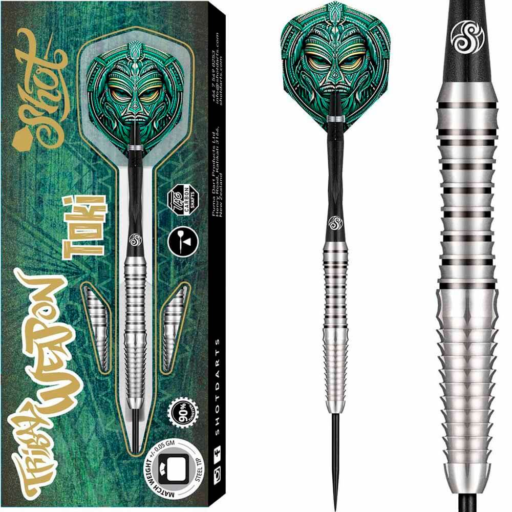 El dardos se compone por 1 ser de 3 cuerpos Tribal Weapon Toki con punta de acero, 1 ser de 3 cañas Shot y 1 set de 3 plumas Shot.