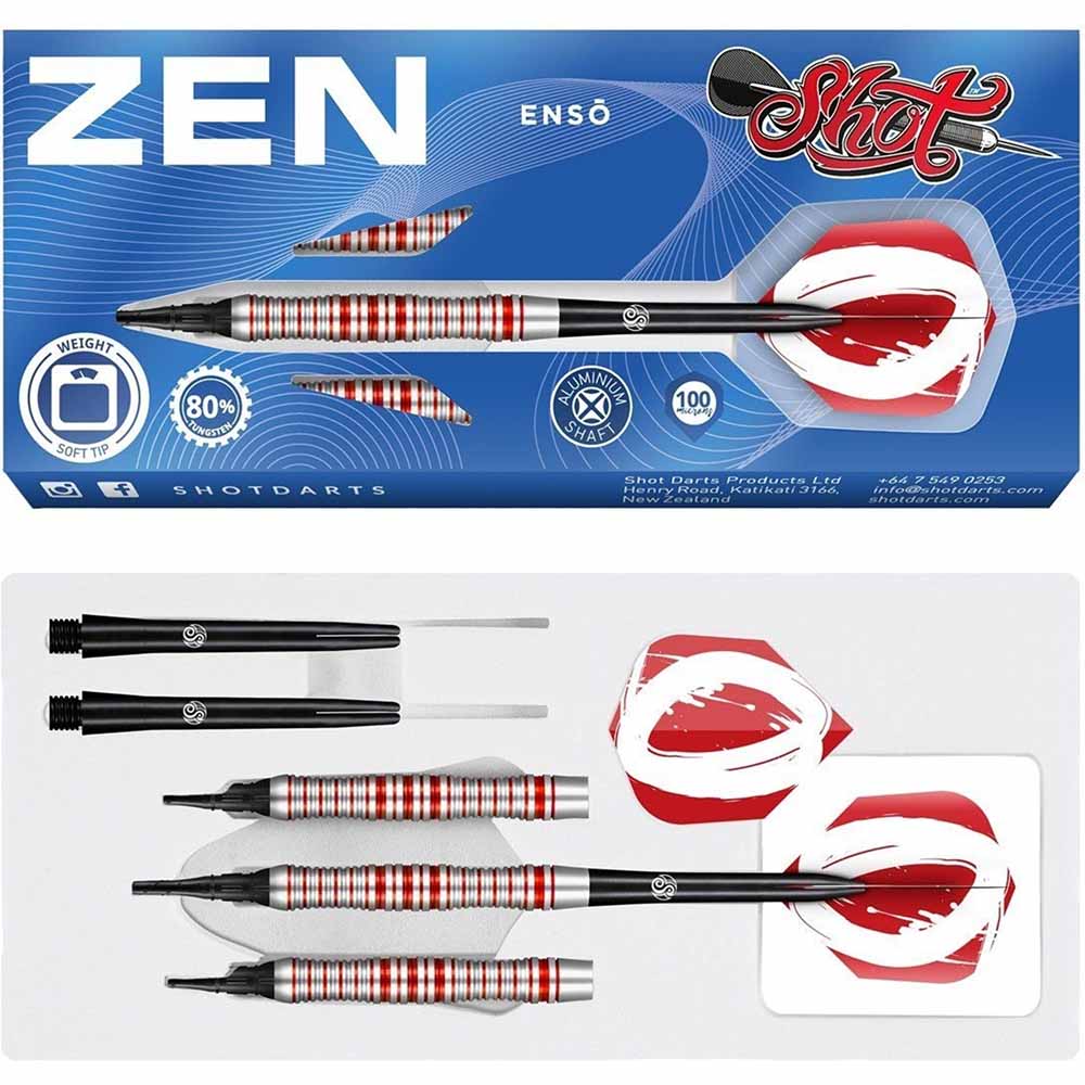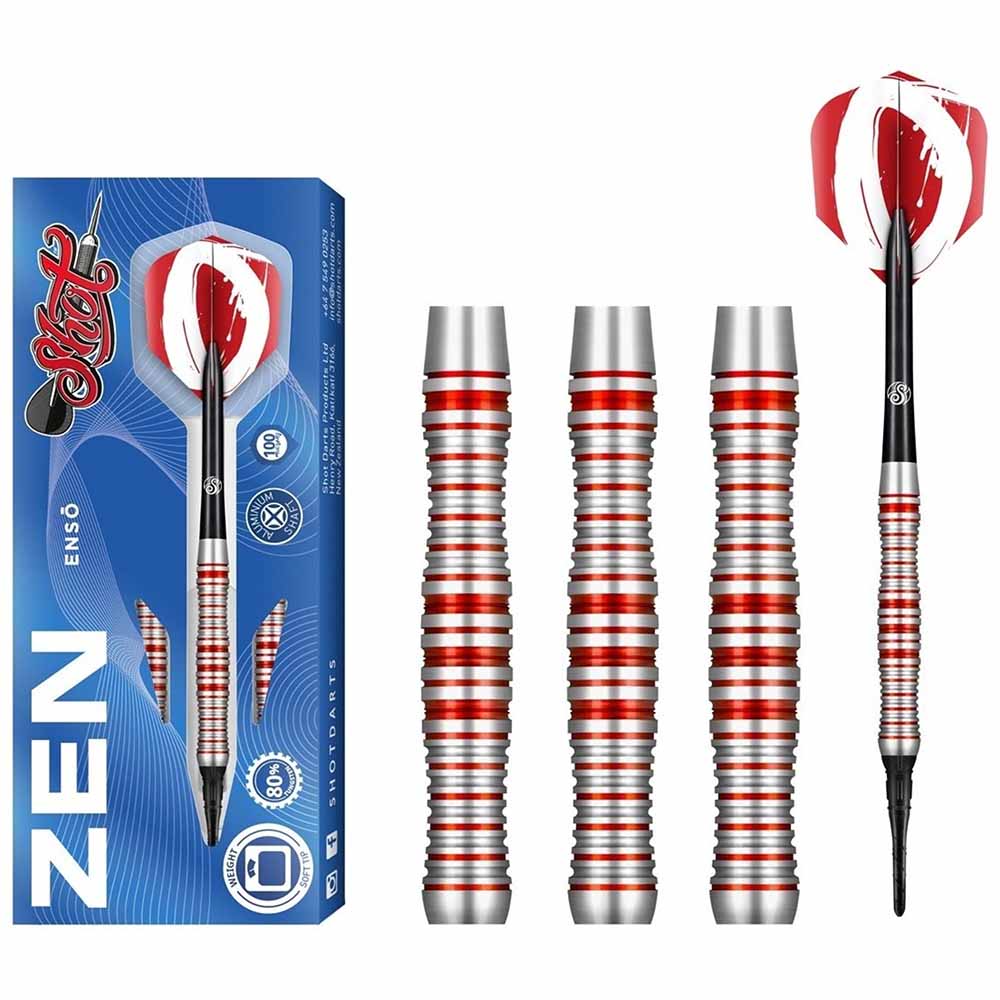 El dardos se compone por 1 ser de 3 cuerpos Shot Zen Enso 80%, 1 ser de 3 cañas, 1 set de 3 plumas y 1 set de 3 puntas 2ba