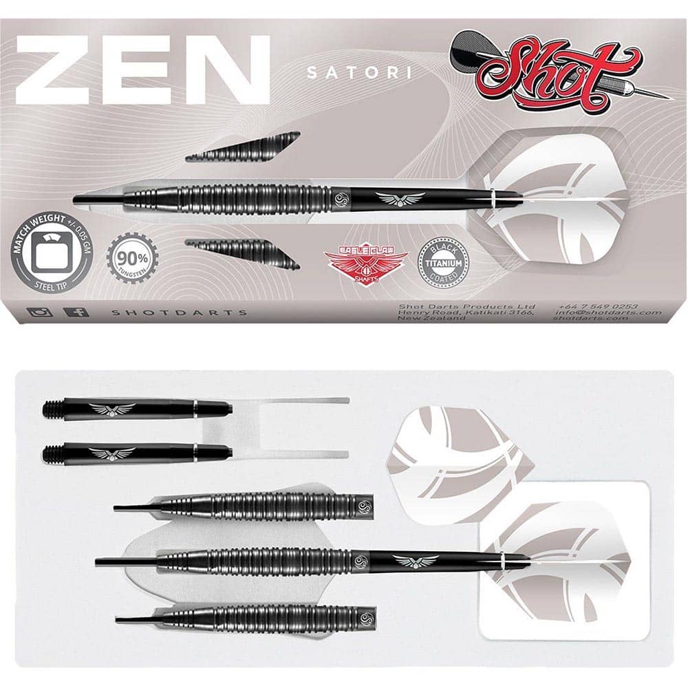 El dardos se compone por 1 ser de 3 cuerpos Shot Zen Satori con punta de metal, 1 ser de 3 cañas y 1 set de 3 plumas.