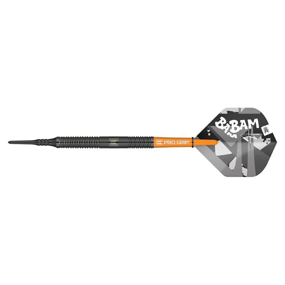 El juego se compone por 1 set de 3 cuerpos de dardos Bradley Brooks Gen 1 18gr, 1 set de 3 cañas Pro Grip Short Naranja, 1 set de 3 plumas Bam Bam y 3 puntas Target Pixel Tip negras.