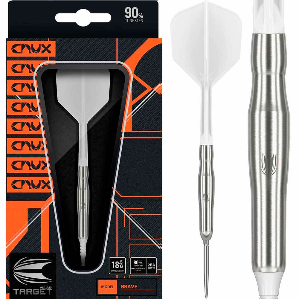 El juego de dardos se compone por 1 set de 3 cuerpos Crux Jpn Brave , 1 set de 3 cañas , 1 set de 3 plumas.