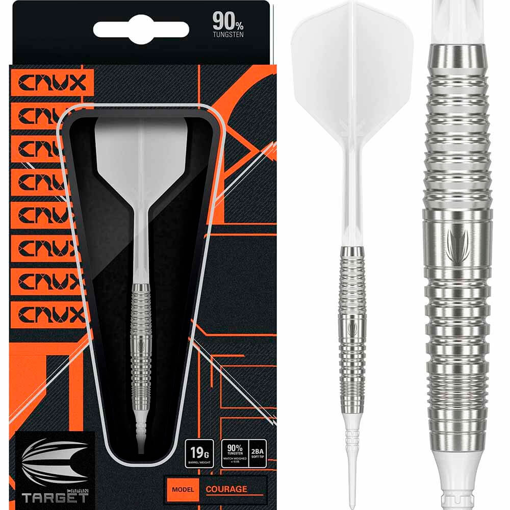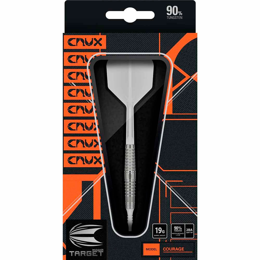 El juego de dardos se compone por 1 set de 3 cuerpos Crux Jpn Courage , 1 set de 3 cañas , 1 set de 3 plumas.