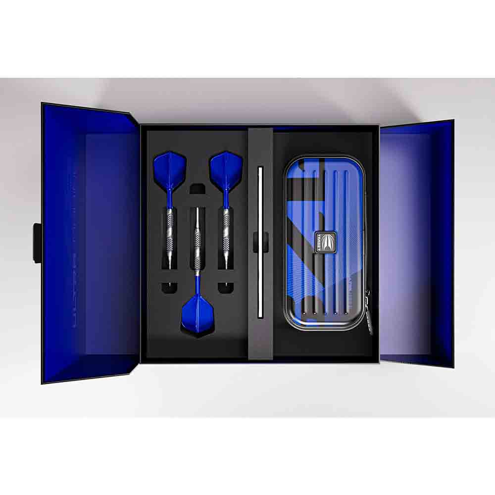 El juego de dardos se compone por 1 set de 3 cuerpos 975 Ultra Marine, 1 set de 3 cañas , 1 set de 3 plumas Target y 1 set de 3 puntas Swiss Point.