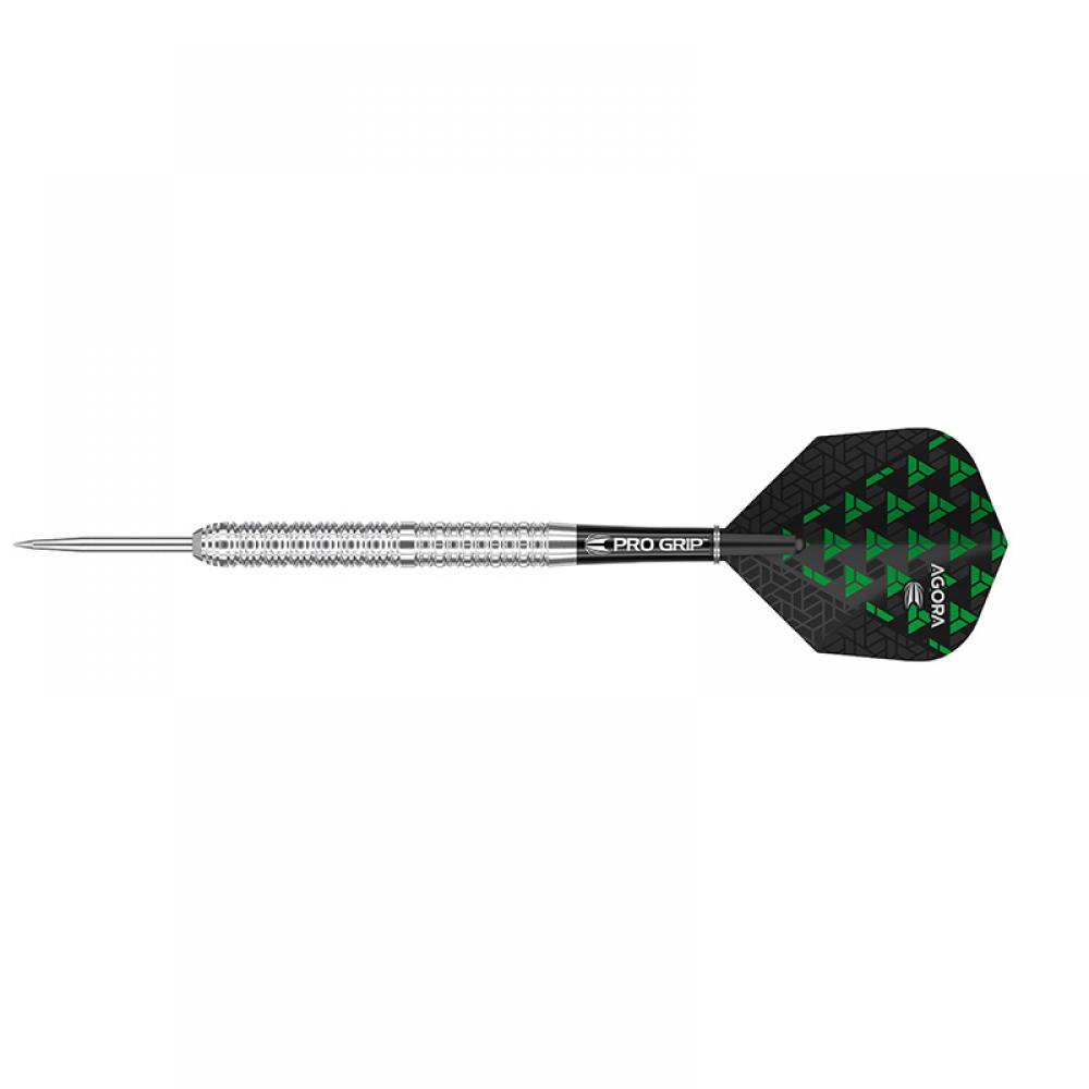 Juego de dardos de la marca Target Darts Agora A05 con peso de 24 gramos, dardos con una característica de gran valor ya que su barril tiene dos tipos de agarre que aporta una increíble precisión gracias a su excelente agarre.