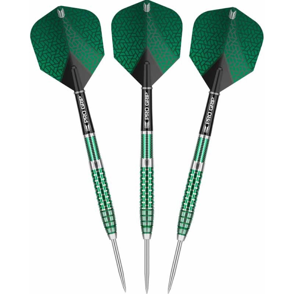 El pack se compone por 3 cuerpos dardos Agora Verde AV03 23 gramos Target Darts, set de 3 plumas Target, set de 3 cañas Pro Grip.
