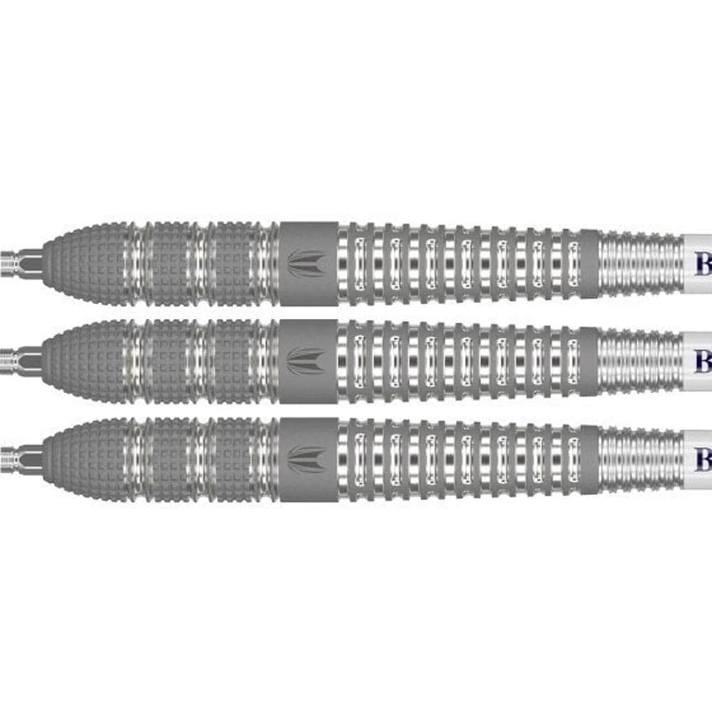 El juego se compone por 1 set de 3 cuerpos de dardos Target Barney 95% , 1 set de 3 cañas Pro Grip corta y 1 set de 3 plumas.