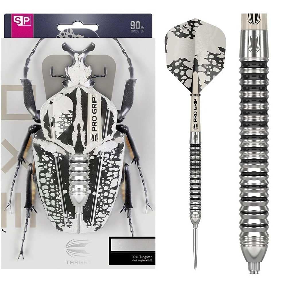 El producto se compone por 1 set de 3 cuerpo modelo Exo 90% SPO1, 1 set de 3 cañas Target Darts, 1 set de 3 plumas y set de 3 puntas Swiss Point.
