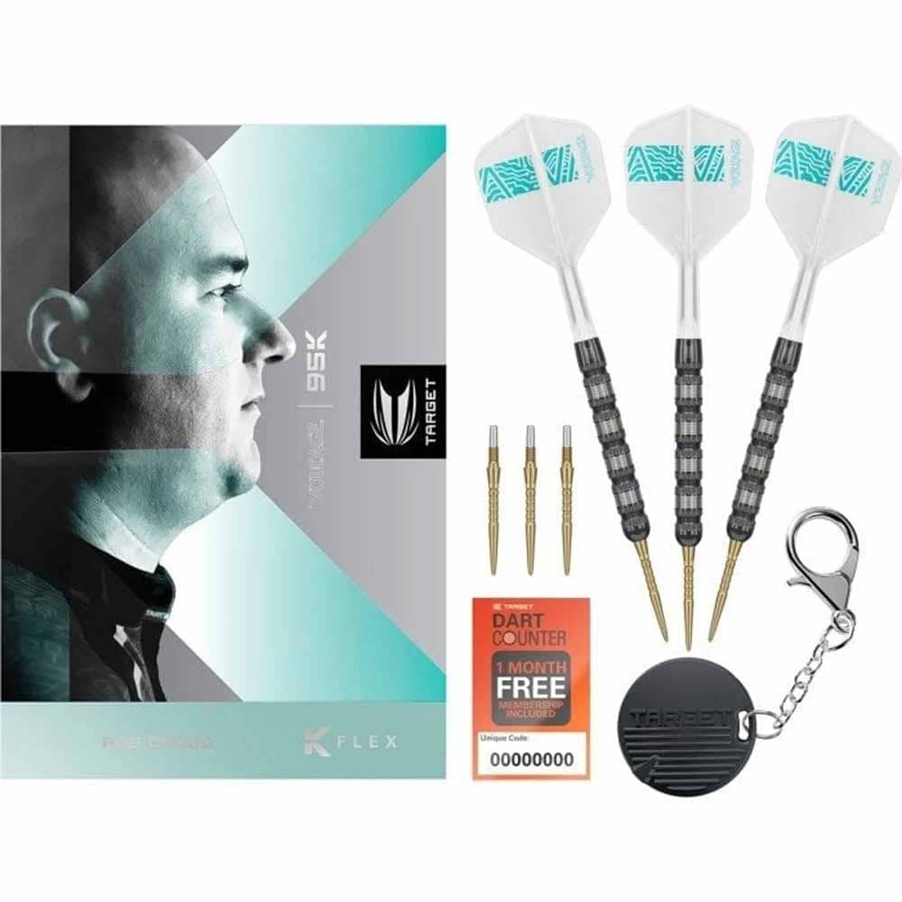 El productos se compone por 1 juego de dardos completo Rob Cross 95K, 1 set de 3 plumas K-Flex y set de 3 puntas 2ba 4mm