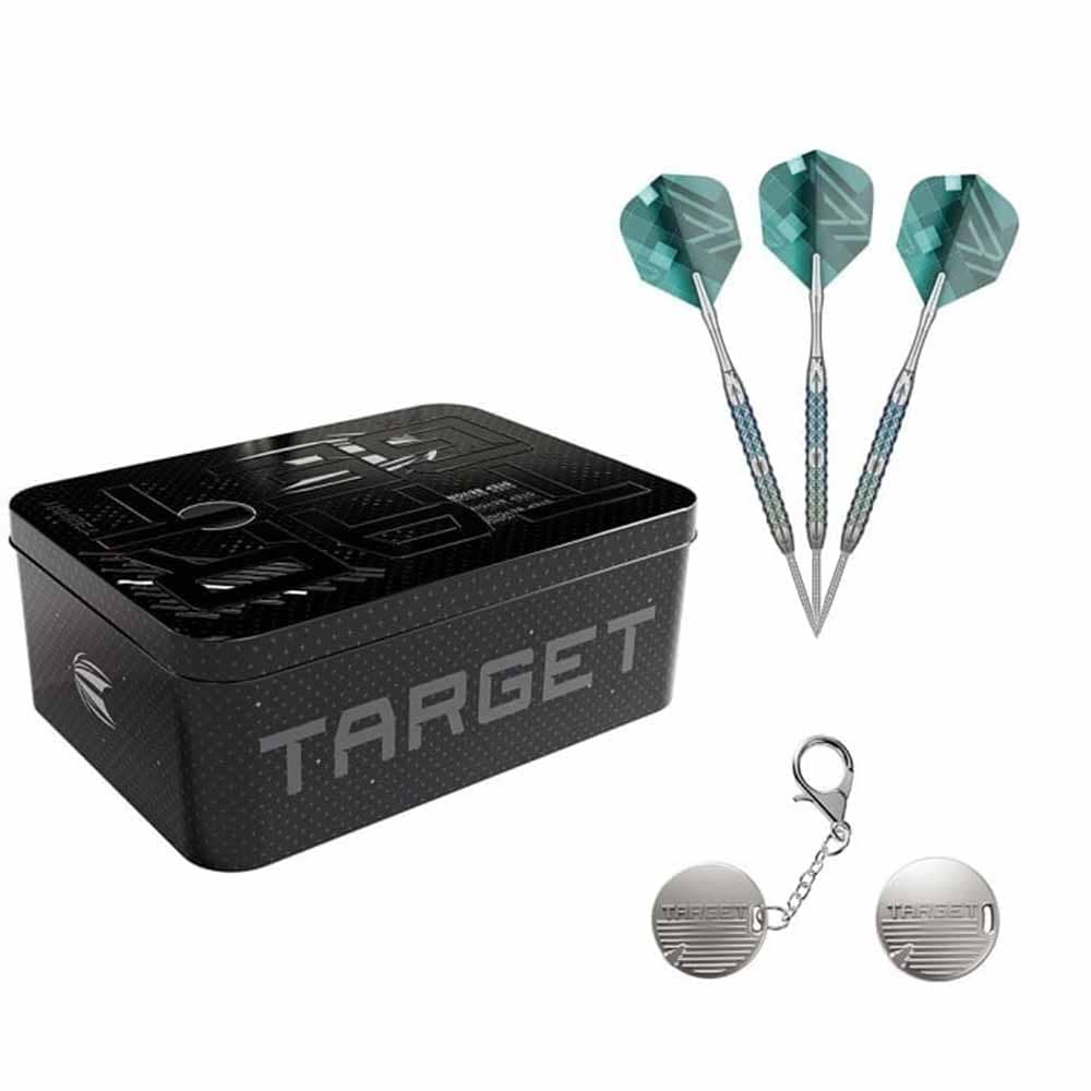 El juego de dardos se compone por 1 set de 3 cuerpos Rove 01 , 1 set de 3 cañas , 1 set de 3 plumas Target y 1 set de 3 puntas Swiss Point