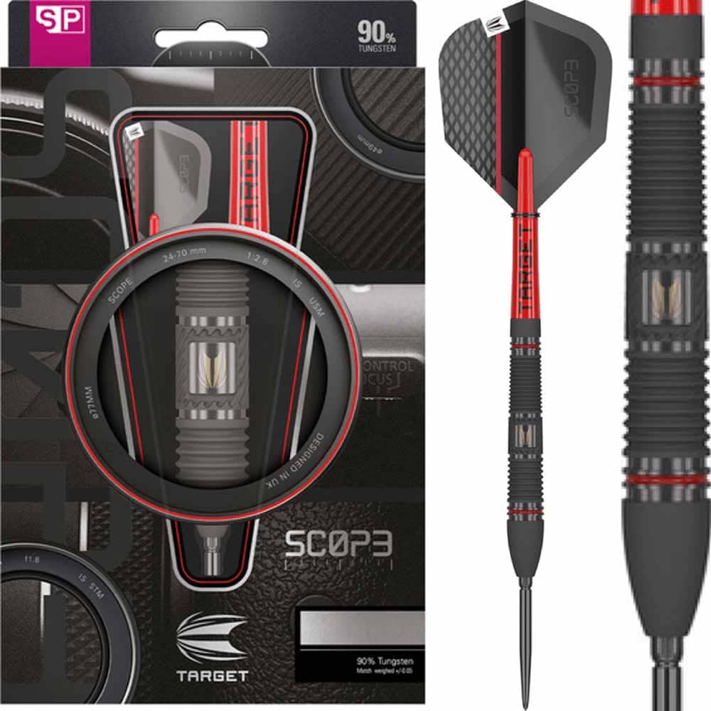 El juego de dardos se compone por 1 set de 3 cuerpos Scope 01 , 1 set de 3 cañas , 1 set de 3 plumas Target y 1 set de 3 puntas Swiss Point