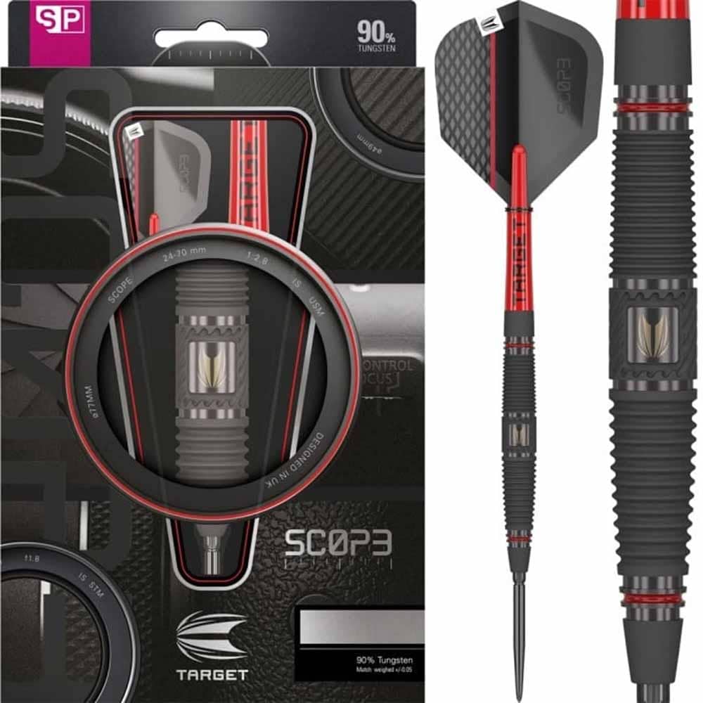 El juego de dardos se compone por 1 set de 3 cuerpos Scope 04 , 1 set de 3 cañas , 1 set de 3 plumas Target y 1 set de 3 puntas Swiss Point
