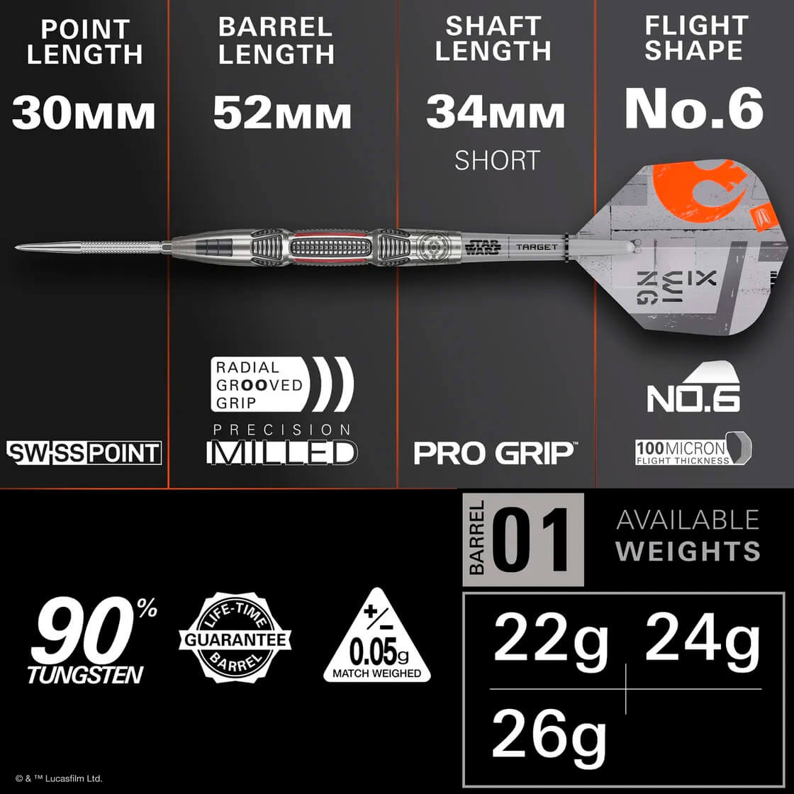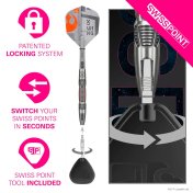 Equipados con puntas suizas GRD plateadas de 30 mm, estos dardos utilizan la tecnología patentada Swiss Point de Target, que ofrece un ajuste seguro y aerodinámico, además de un reemplazo rápido con herramienta. Las ranuras grabadas con láser proporcionan un mejor agarre del tablero, lo que refuerza el rendimiento y el estilo de juego.