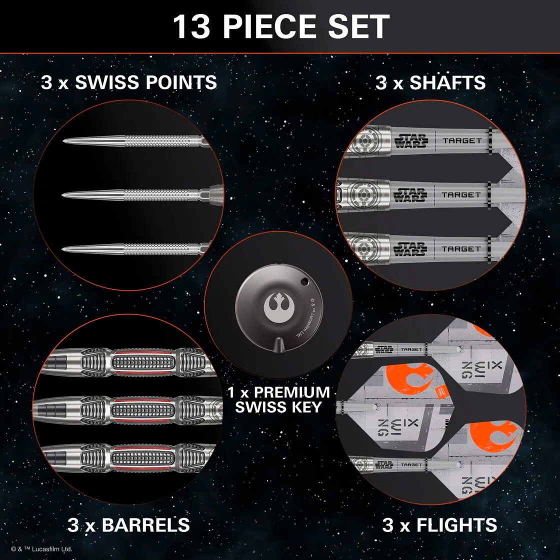 El producto se compone por 1 set de 3 cuerpos Star Wars X-WING , 1 set de 3 plumas Star Wars X-WING , 1 set de 3 cañas Target Star Wars y 1 set de 3 puntas Swiss Point