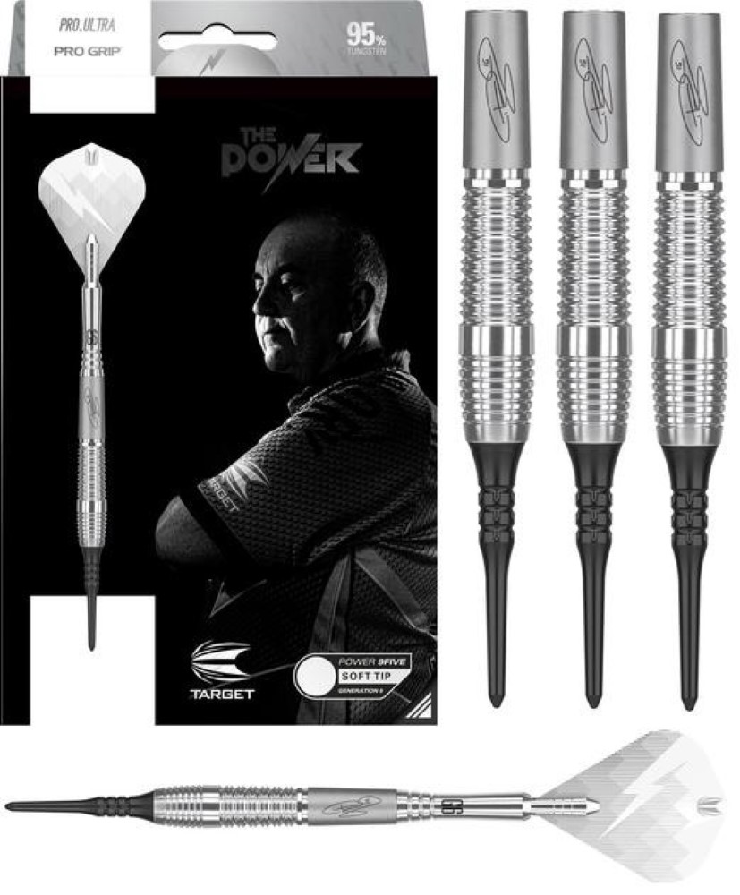 El pack se compone por 3 cuerpos dardos The Power Phil Taylor 20g gramos Target Darts, set de 3 plumas Target, set de 3 cañas Pro Grip y 3 puntas soft tip 2ba 4mm