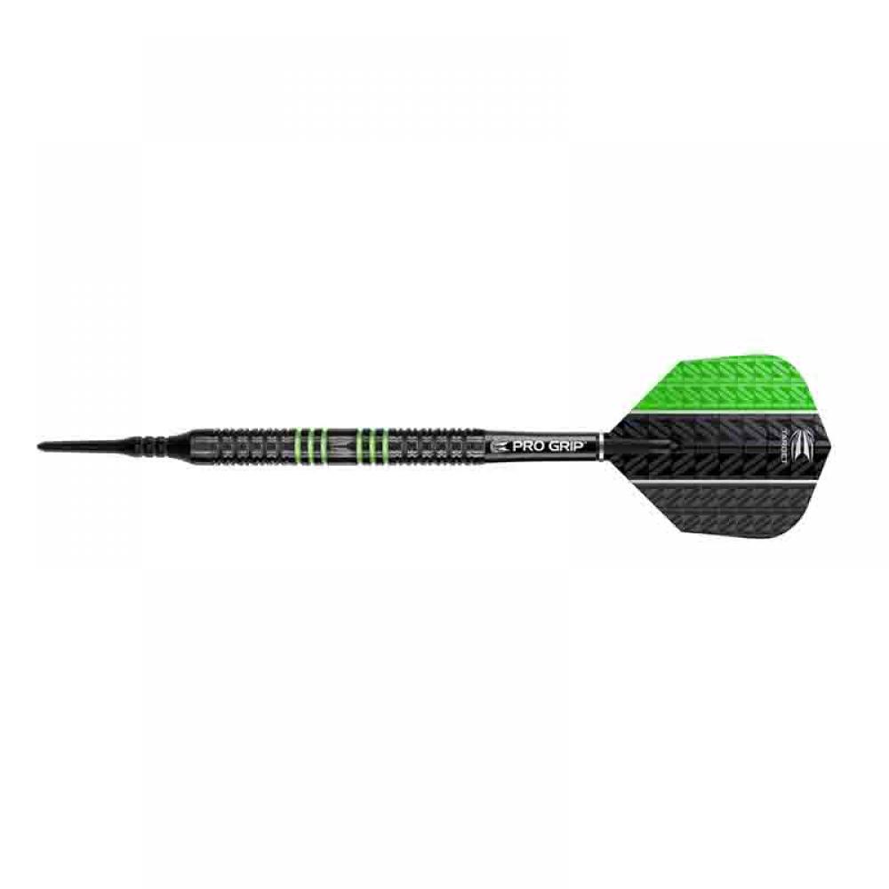 El juego de dardos se compone por 1 set de 3 cuerpos de dardos Target Black Green, 1 set de 3 cañas Pro Grip, 1 set de 3 plumas Vapor, 1 set de 3 puntas pixel 2ba 4mm y una funda de skay para guardar los dardos desmontados.