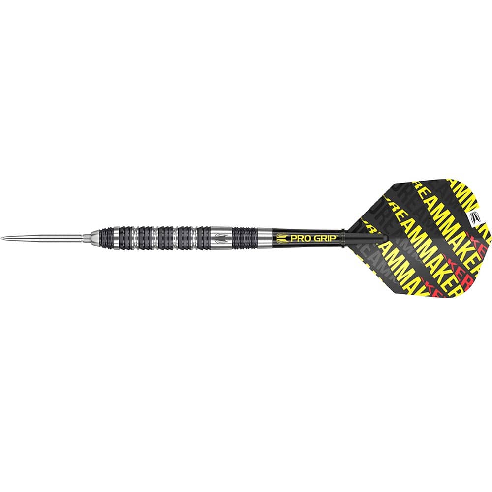 El juego se compone por 1 set de 3 cuerpos de dardos Target Dimitri Van Den Bergh SP, 1 set de 3 cañas Pro Grip roja corta y 1 set de 3 plumas