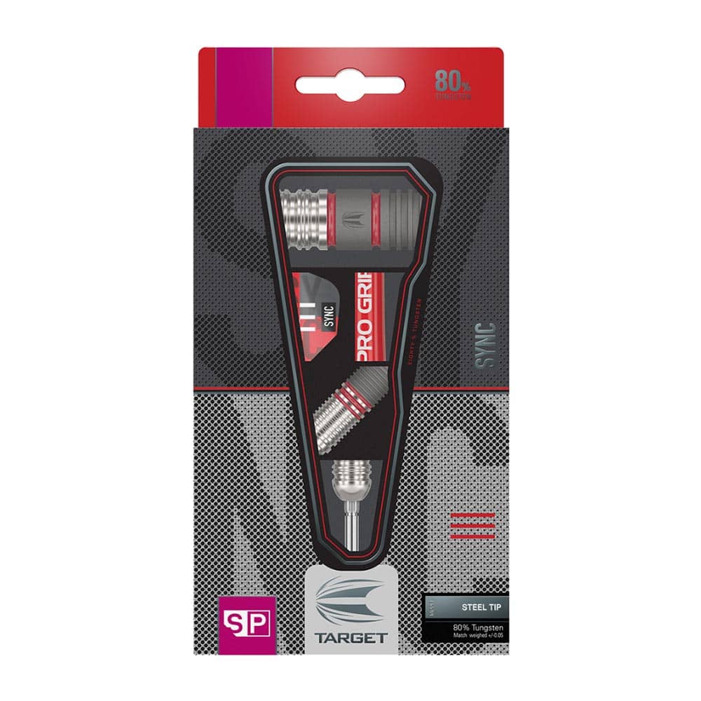 El juego se compone por 1 set de 3 cuerpos de dardos Target Sync con punta Swiss Point Silver 26mm, 1 set de 3 cañas Pro Grip roja corta y 1 set de 3 plumas Sync No.6 Shape