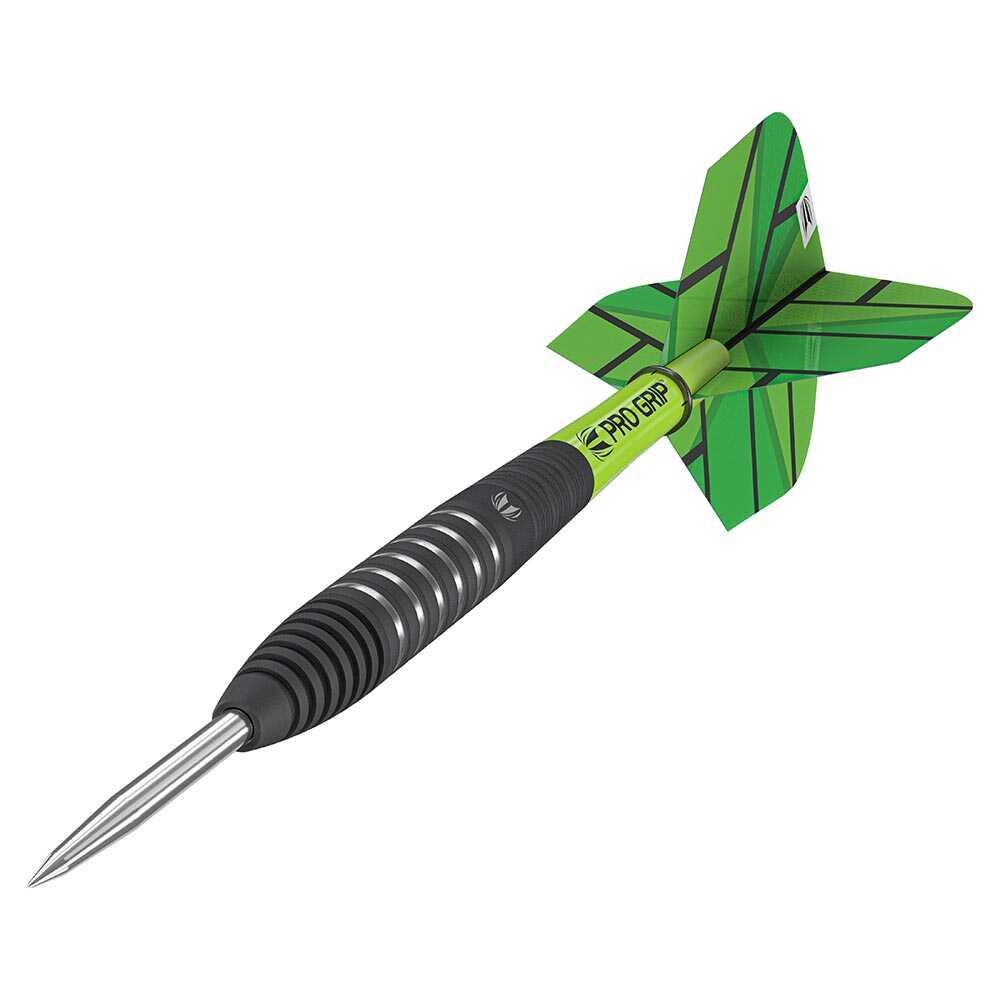 El juego se compone por 1 set de 3 cuerpos de dardos con punta de metal Yohkoh 03 21gr, 1 set de 3 cañas Pro Grip Short Verde, 1 set de 3 plumas Pro Ultra y 1 pequeña funda de cuero negra.