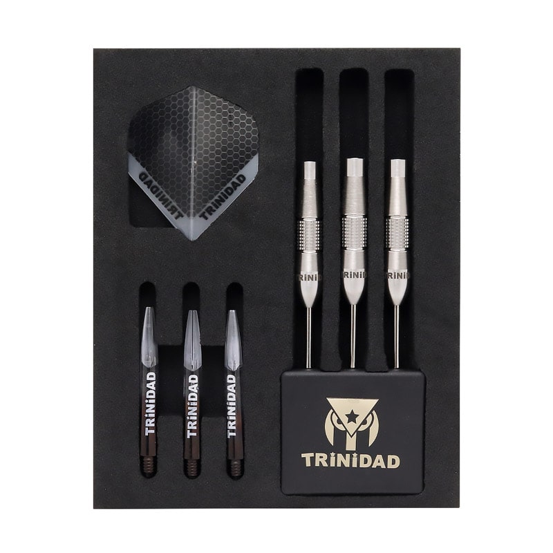 El juego de dardos se compone por 1 set de 3 cuerpos Duran Type 5 con punta de metal, 1 set de 3 plumas Trinidad y 1 set de 3 cañas Trinidad.