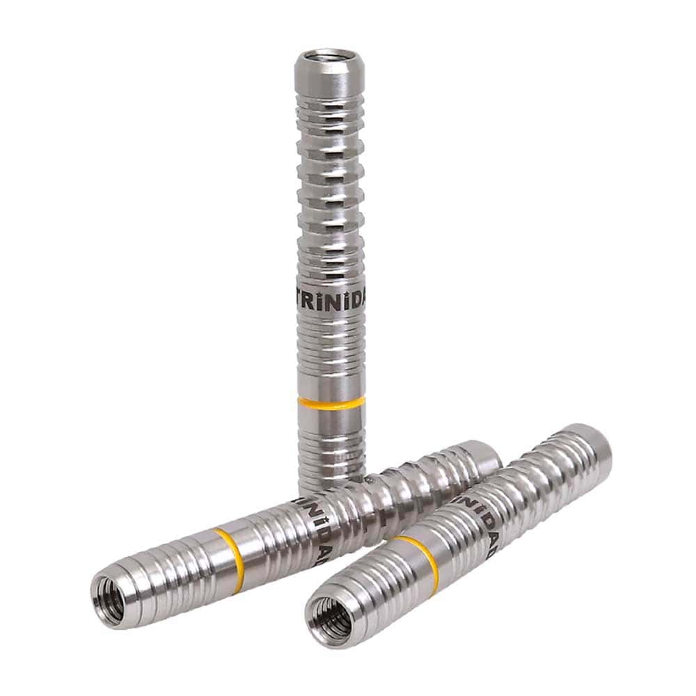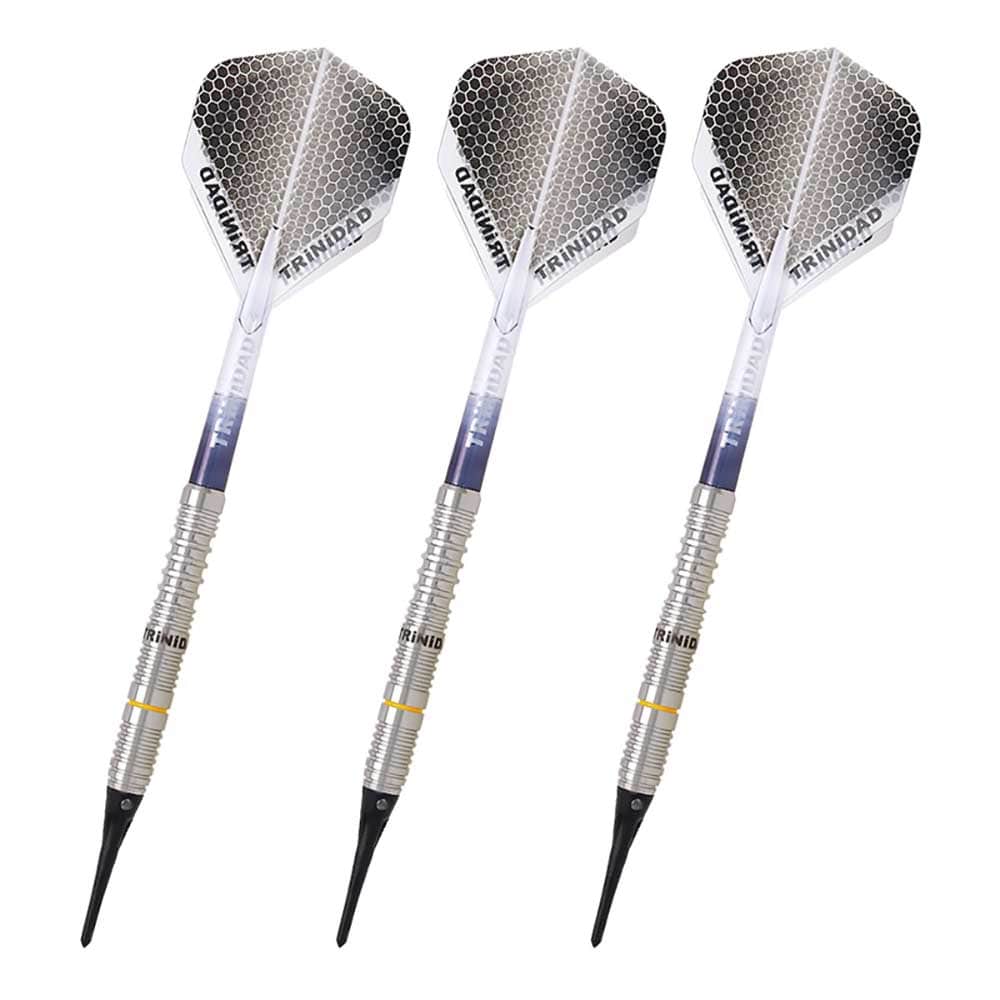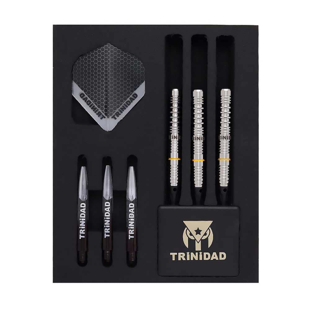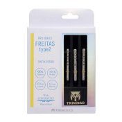 El juego de dardos se compone por 1 set de 3 cuerpos Freitas Type 2 Shota Sosogi, 1 set de 3 plumas Trinidad, 1 set de 3 cañas Trinidad y 1 set de 3 puntas de plástico rosca 2ba 4mm.