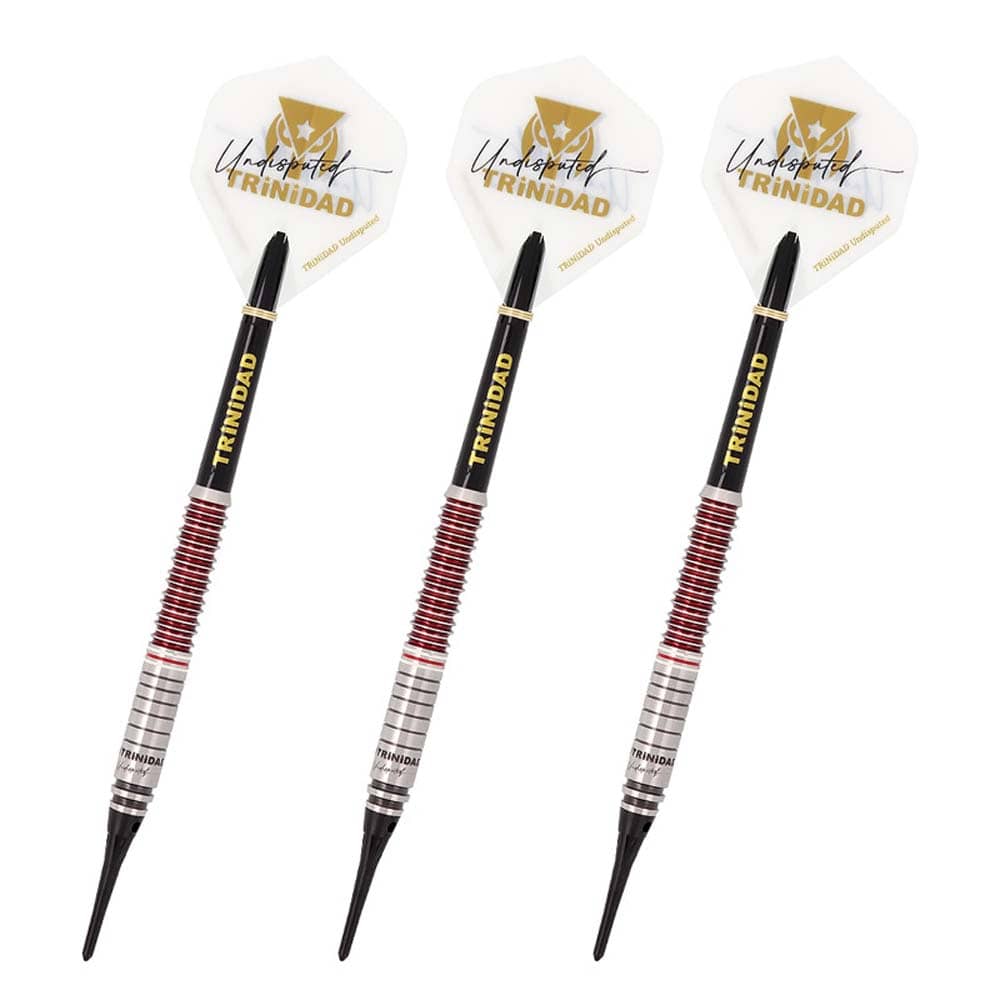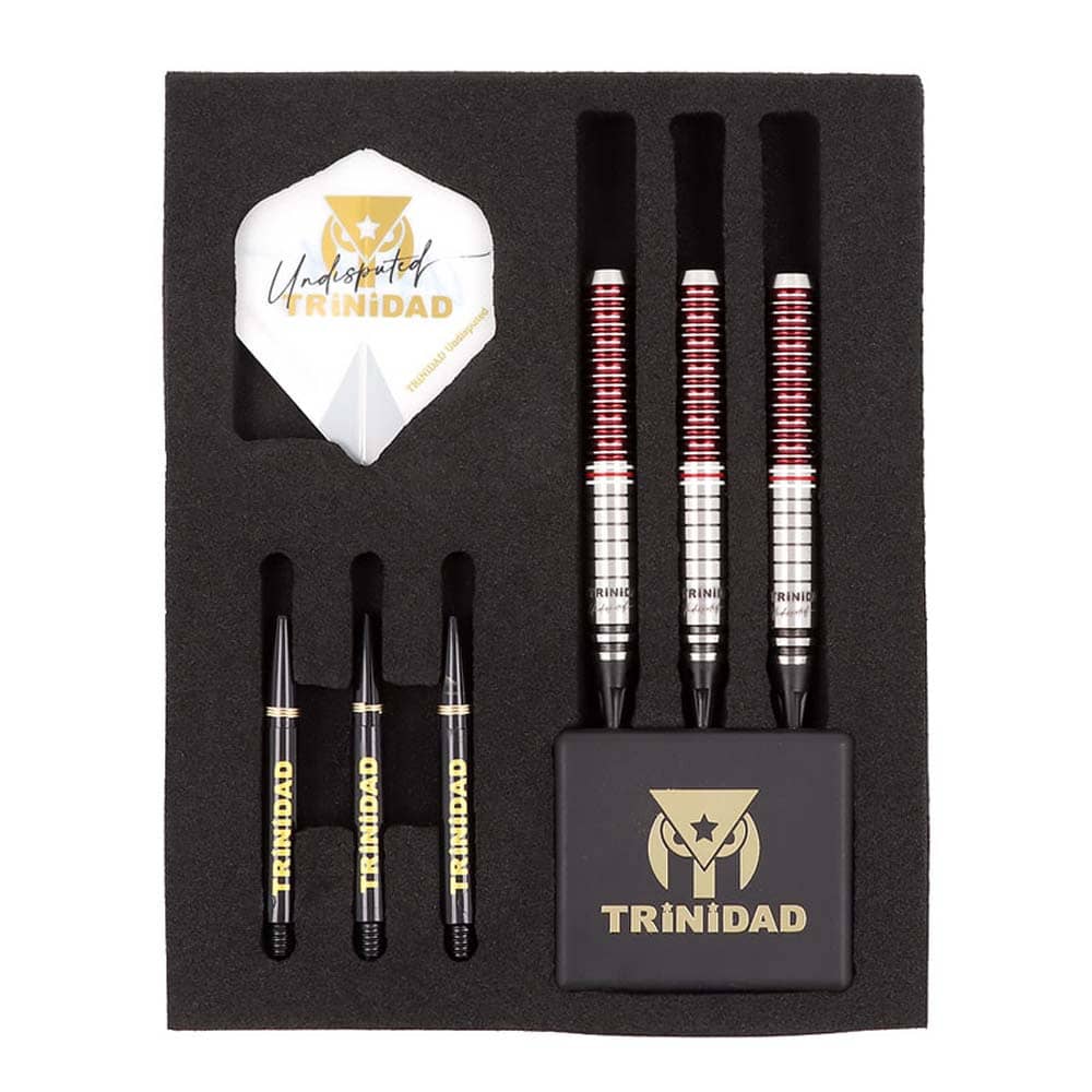 El juego de dardos se compone por 1 set de 3 cuerpos Gomez Type16, 1 set de 3 plumas Trinidad, 1 set de 3 cañas Trinidad y 3 puntas de plástico 2ba.