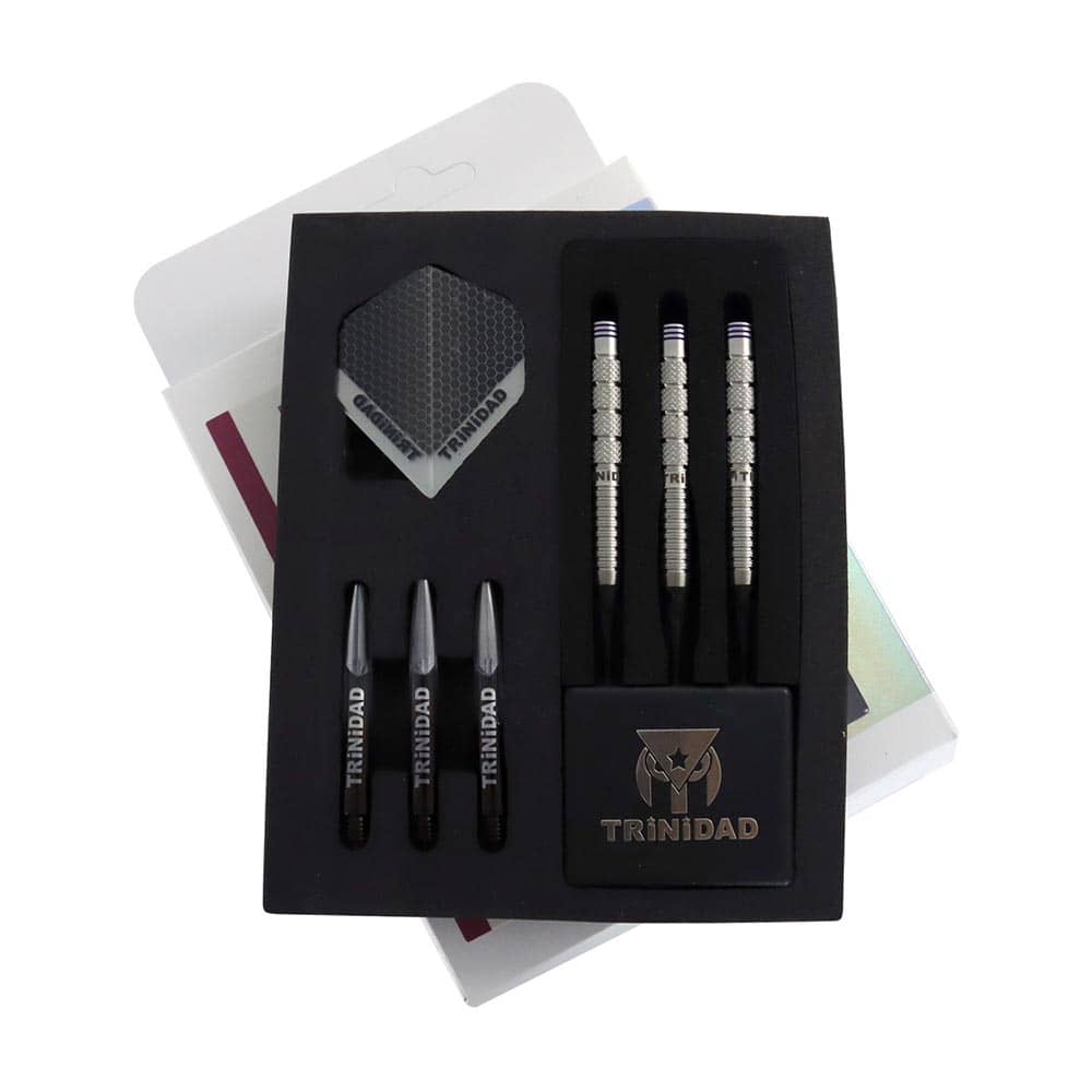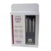 El juego de dardos se compone por 1 set de 3 cuerpos Eder Type2, 1 set de 3 plumas Trinidad, 1 set de 3 cañas Trinidad, 1 set de 3 puntas de plástico rosca 2ba 4mm y 1 protector de puntas de plástico.