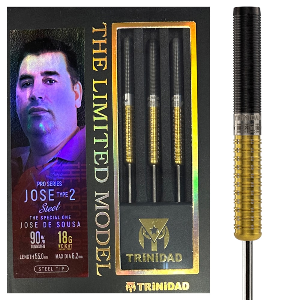 El juego de dardos se compone por 1 set de 3 cuerpos Jose Type 2 Limited Edition con punta de metal, 1 set de 3 plumas Trinidad y 1 set de 3 cañas Trinidad.