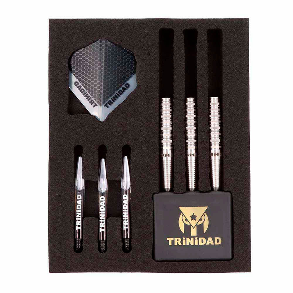 El juego de dardos se compone por 1 set de 3 cuerpos Rafael Kojima, 1 set de 3 plumas Trinidad y 1 set de 3 cañas Trinidad.