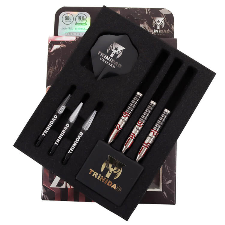 El juego de dardos se compone por 1 ser de 3 cuerpos Zapata Yutaro Abe steel tip y 1 set de 3 plumas Trinidad.