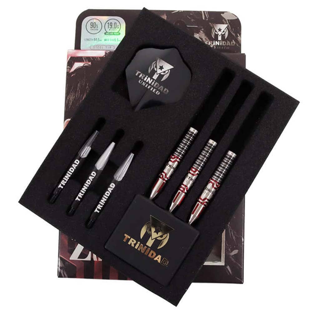 El juego de dardos se compone por 1 set de 3 cuerpos Trinidad Zapata con punta de acero, 1 set de 3 plumas Trinidad y 1 set de 3 cañas Trinidad.