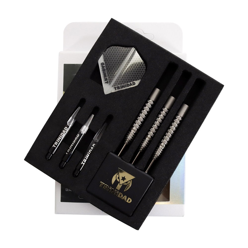 El juego de dardos Trinidad Eder Type 4 se compone por 1 set de 3 cuerpos Eder , 1 set de 3 plumas Condor y 1 set de 3 puntas 2ba 4mm