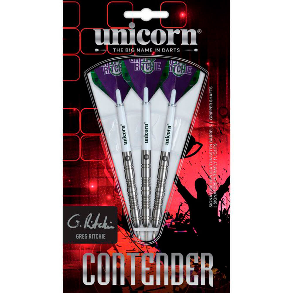 El juego de dardos Unicorn Contender Greg Ritchie se compone por 1 set de 3 cuerpos con punta de metal, 1 set de 3 cañas Unicorn medium y 1 set de 3 plumas Ultrafly Unicorn.