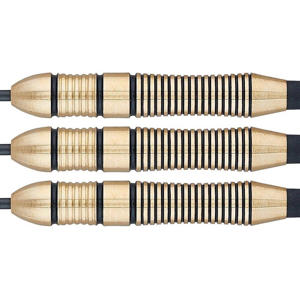 El producto se compone por 1 set de 3 cuerpos de dardos Core Plus Brass S1 de Unicorn Darts , 1 set de 3 plumas y 1 set de 3 cañas .