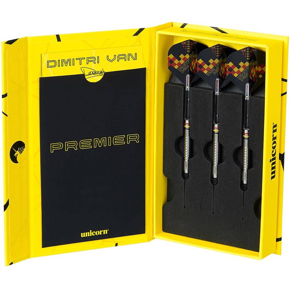 El juego de dardos Unicorn Premier Dimitri Van Den Bergh se compone por 1 set de 3 cuerpos, 1 set de 3 cañas Unicorn medium y 1 set de 3 plumas Unicorn y 3 puntas de plástico Unicorn Epic.