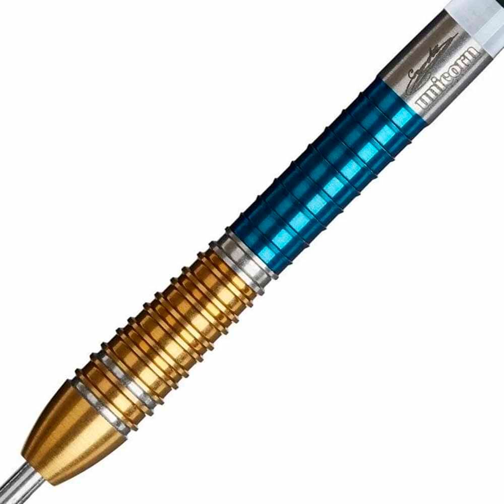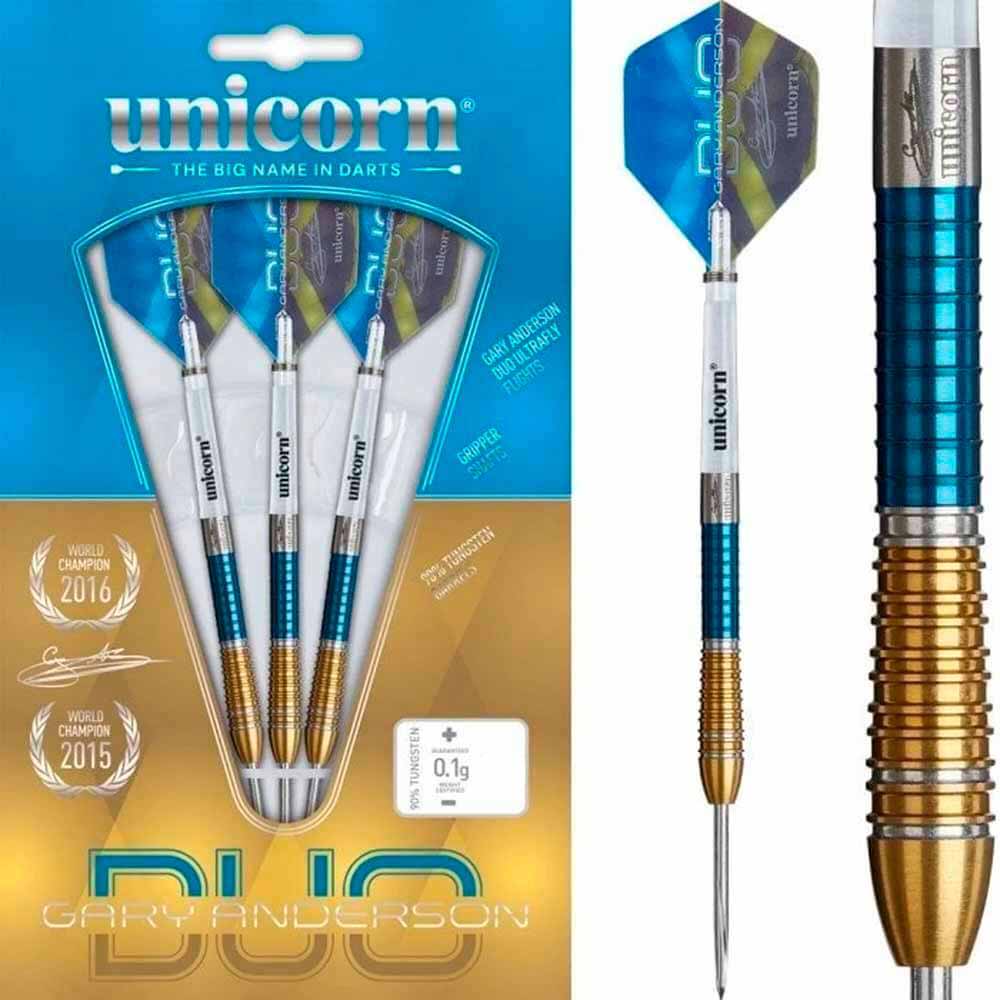 El juego de dardos se compone por: 1 set de 3 cuerpos Unicorn Gary Anderson Phase 6 Duo 90%, 1 set de 3 cañas Unicorn Darts, 1 set de 3 plumas.