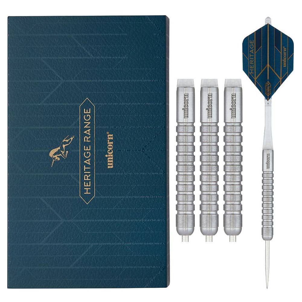 El producto se compone por 1 set de 3 cuerpos de dardos con punta de metal Heritage Striker 1988 de Unicorn Darts , 1 set de 3 plumas y 1 set de 3 cañas .