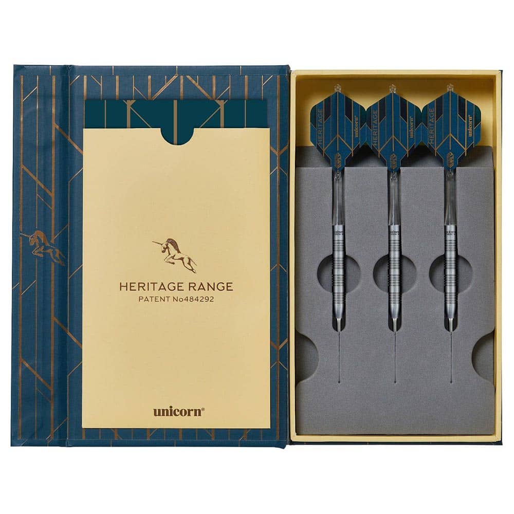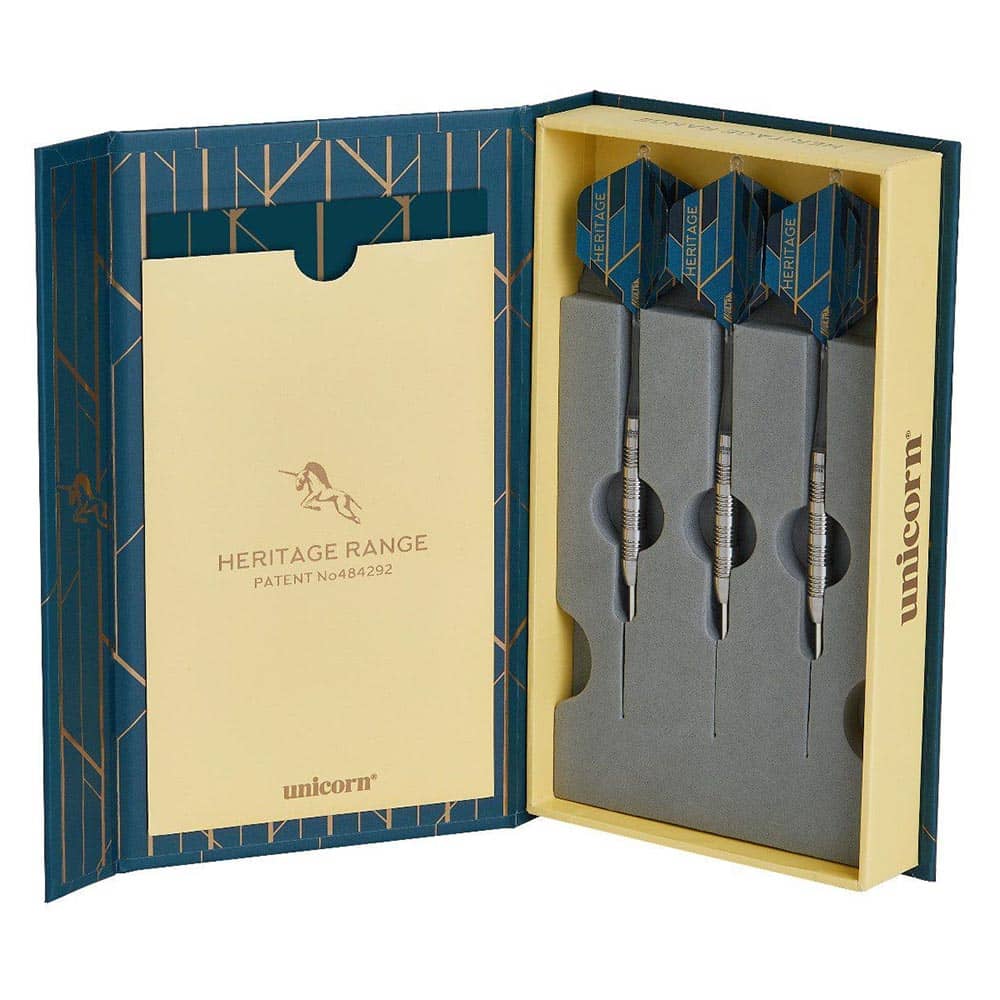 El producto se compone por 1 set de 3 cuerpos de dardos con punta de metal Heritage Striker 1988 de Unicorn Darts , 1 set de 3 plumas y 1 set de 3 cañas.