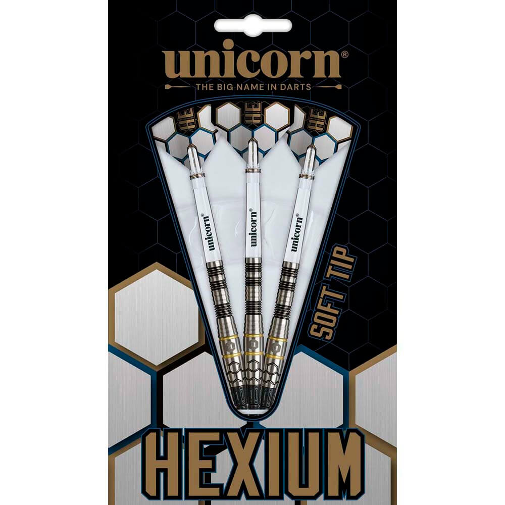 El juego de dardos Unicorn Hexium 1 Black Gold se compone por 1 set de 3 cuerpos, 1 set de 3 cañas Unicorn , 1 set de 3 plumas Unicorn y 1 set de 3 puntas 2ba 4mm