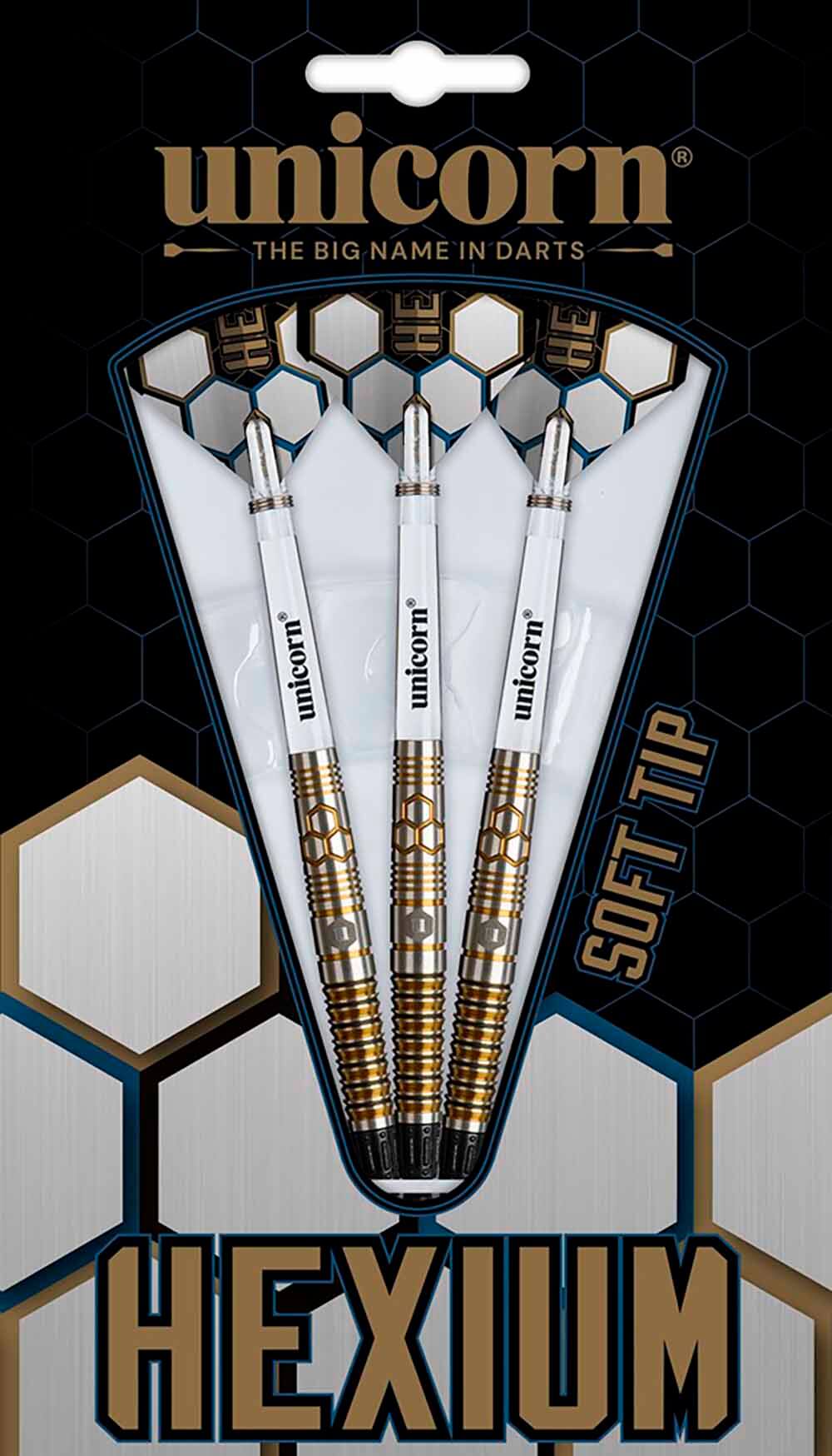 El juego de dardos Unicorn Hexium 3 Black Gold se compone por 1 set de 3 cuerpos, 1 set de 3 cañas Unicorn medium y set de 3 plumas Unicorn Noir.