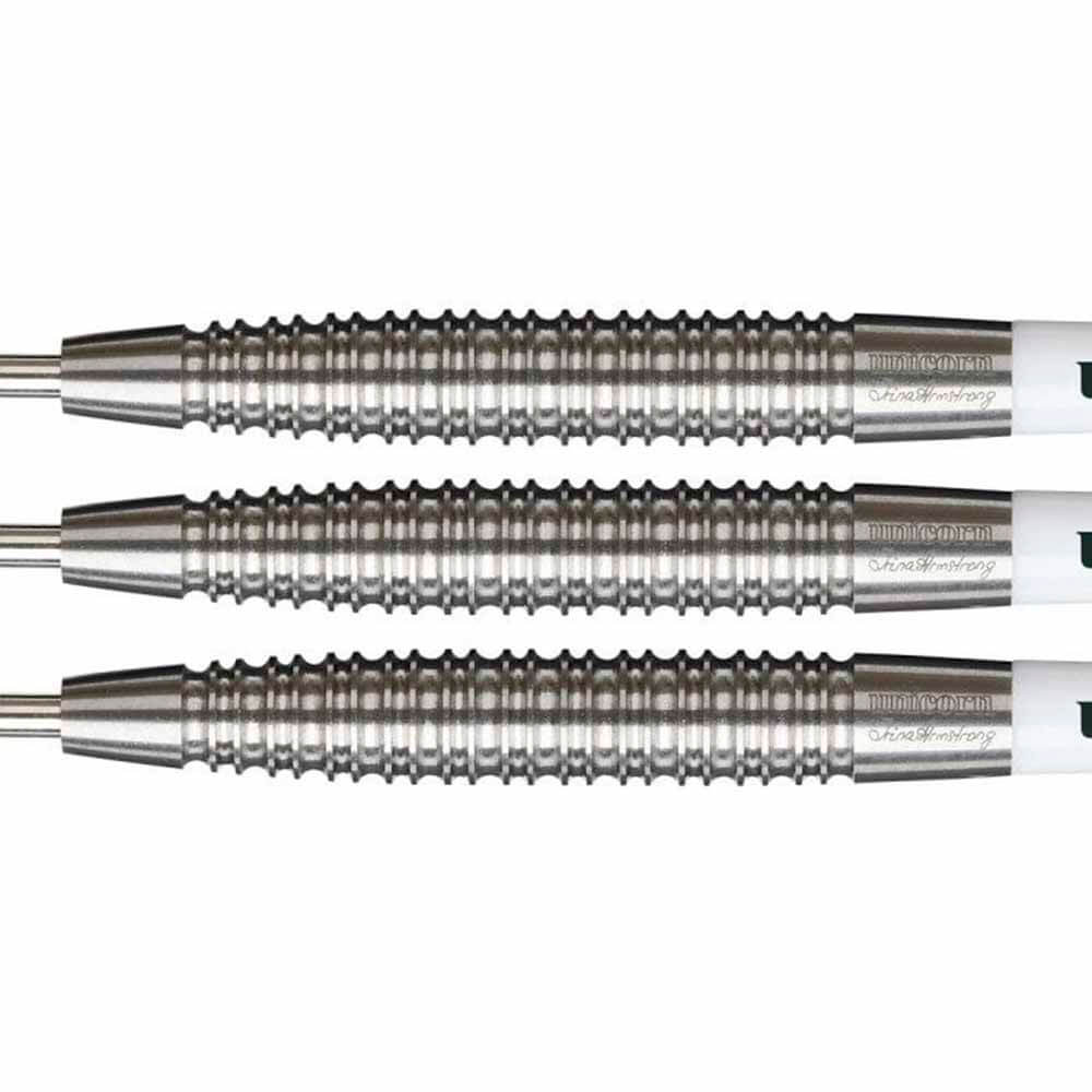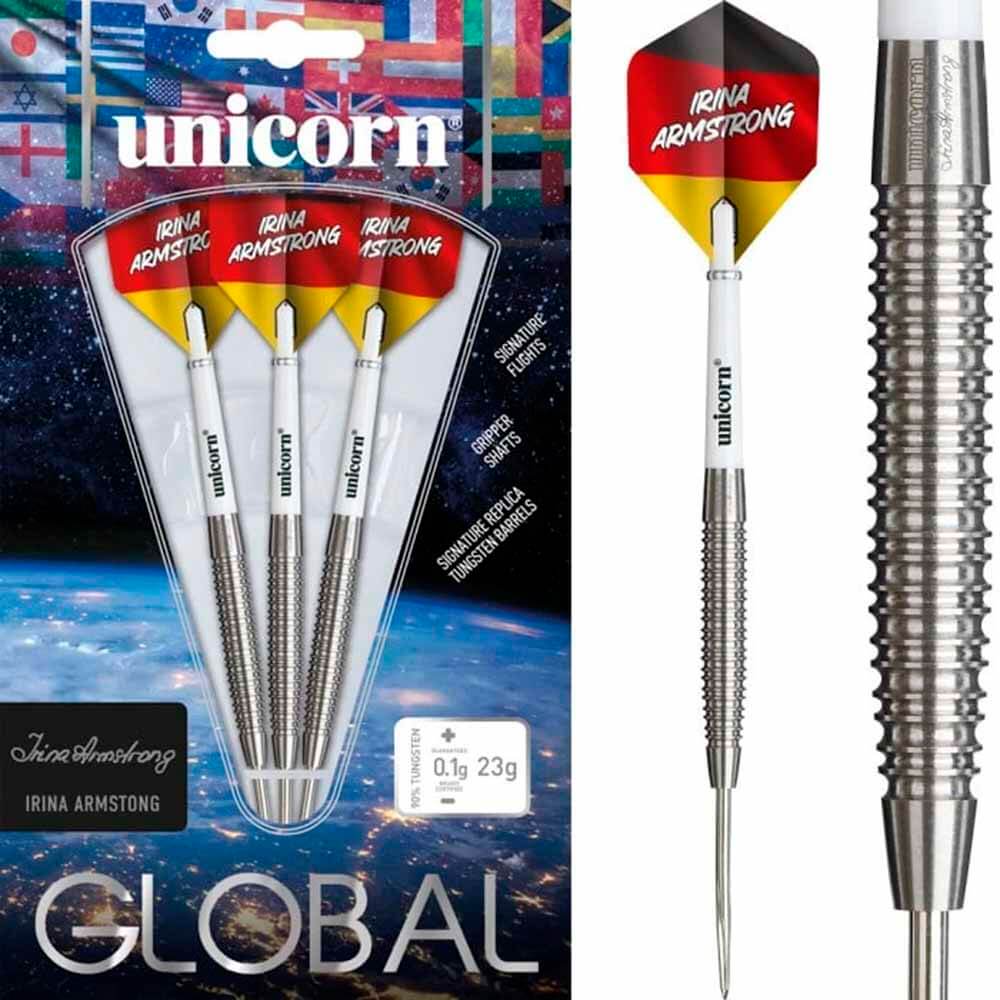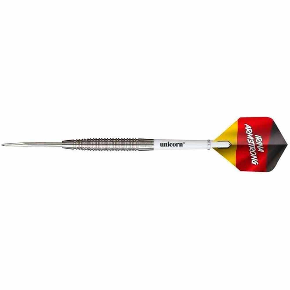 El juego de dardos se compone por: 1 set de 3 cuerpos Unicorn Irina Armstrong 90%, 1 set de 3 cañas Unicorn Darts, 1 set de 3 plumas modelo Irina Armstrong.