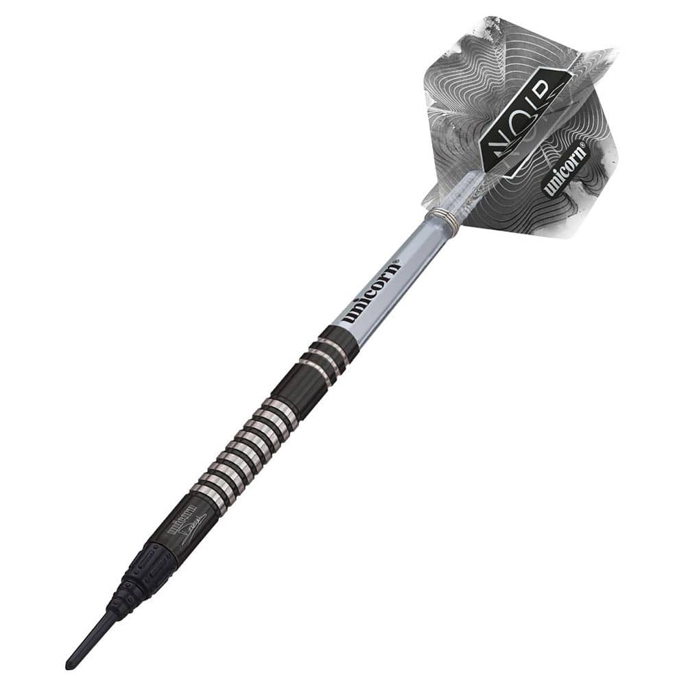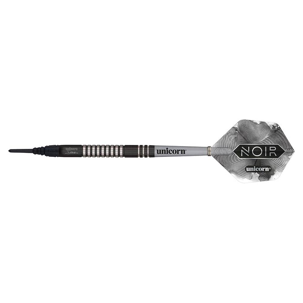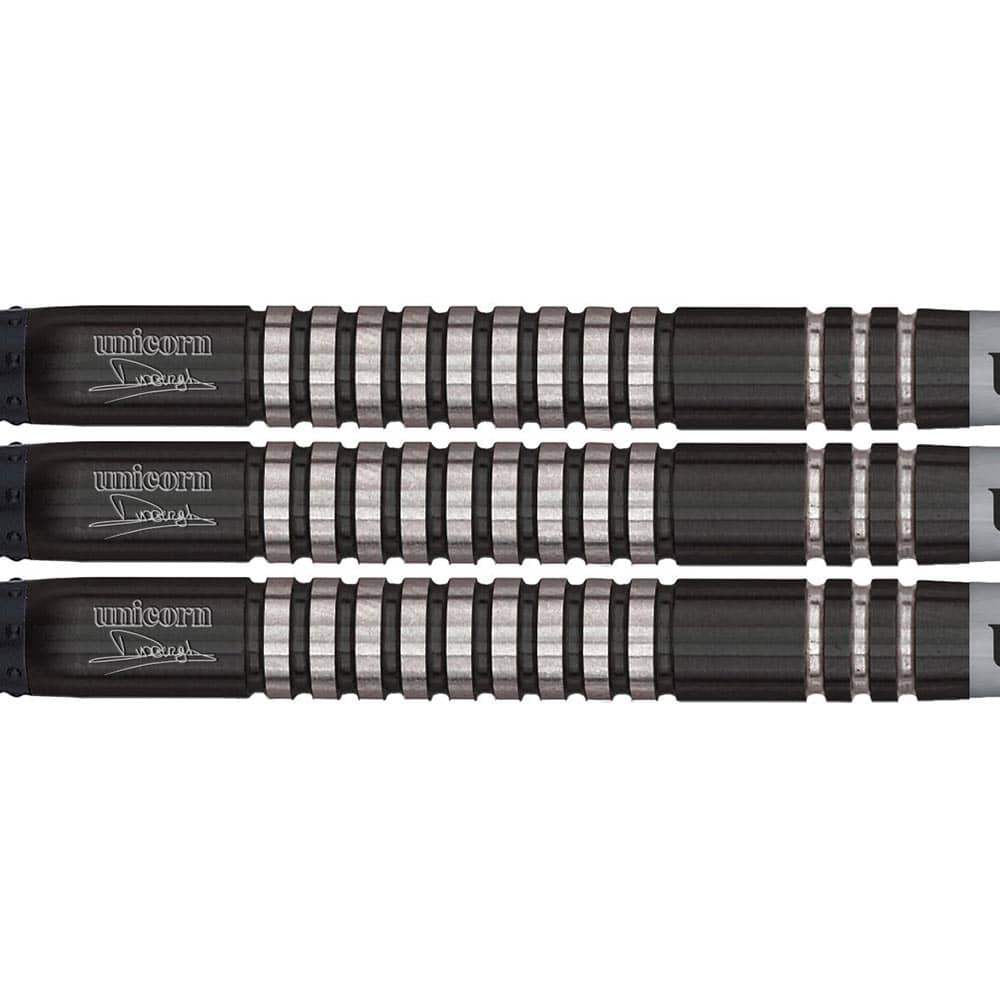 El juego de dardos Unicorn Noir Dimitri van den Bergh se compone por 1 set de 3 cuerpos, 1 set de 3 cañas Unicorn medium, 1 set de 3 plumas Unicorn Noir y 3 puntas de plástico Epic Unicorn 2ba