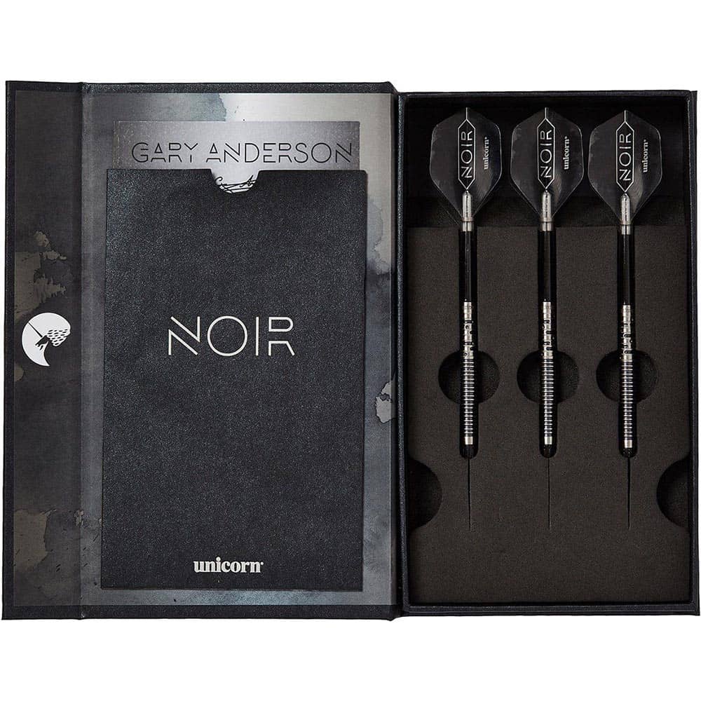 El juego de dardos Unicorn Noir Gary Anderson Phase 5 se compone por 1 set de 3 cuerpos, 1 set de 3 cañas Unicorn medium, 1 set de 3 plumas Unicorn Noir y 3 puntas de plástico Unicorn Epic 2ba