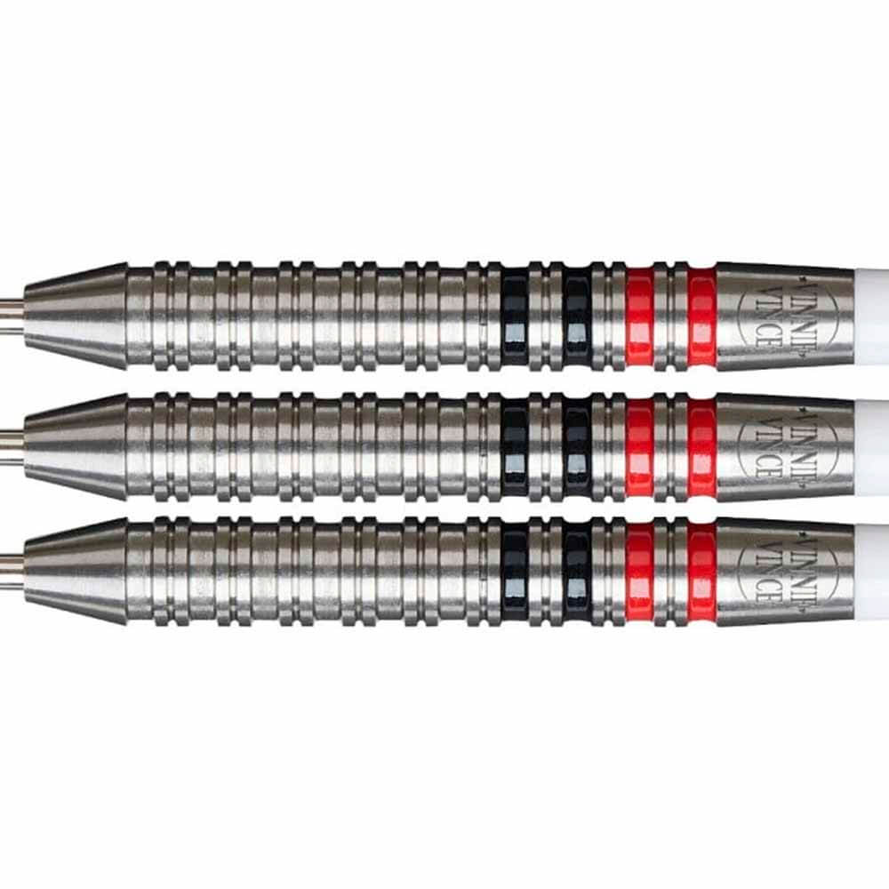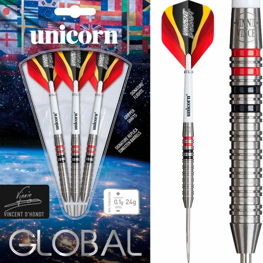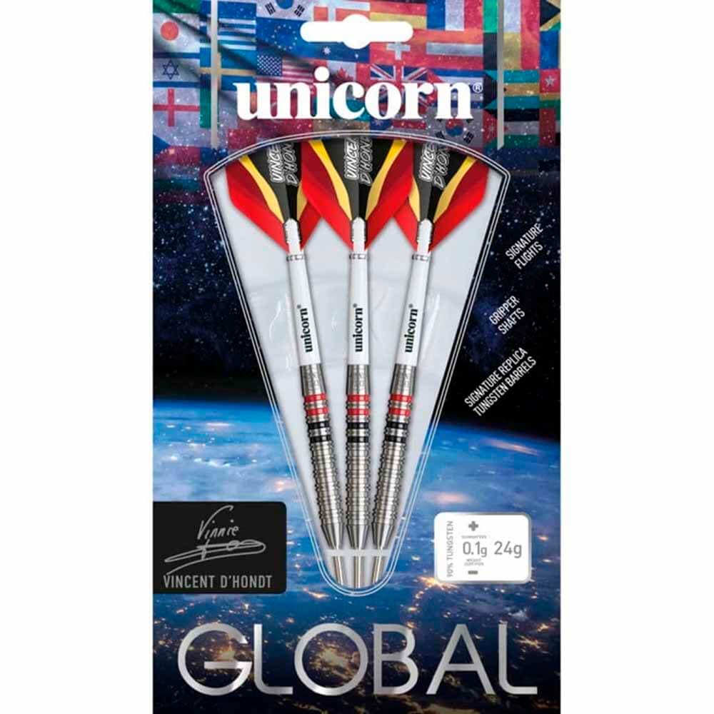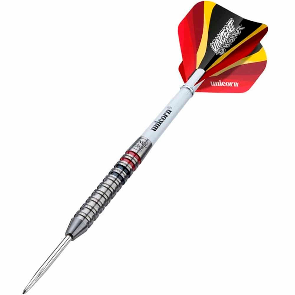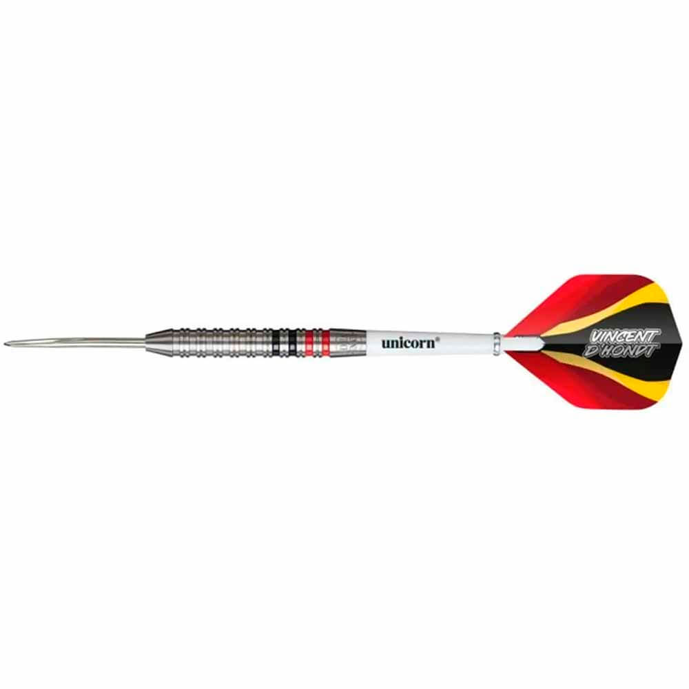 El juego de dardos se compone por: 1 set de 3 cuerpos Unicorn Vincent DHondt 90%, 1 set de 3 cañas Unicorn Darts, 1 set de 3 plumas modelo Vincent DHondt.