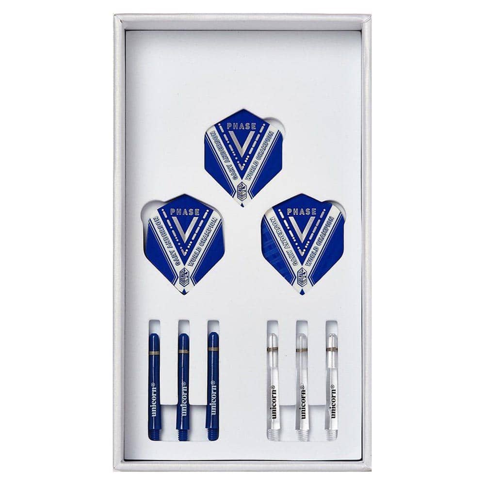 El juego de dardos Unicorn W.C. Gary Anderson Phase 5 se compone por 1 set de 3 cuerpos, 3 sets de 3 cañas Unicorn medium, 4 sets de 3 plumas Unicorn y 3 puntas de plástico Unicorn Epic con rosca 2ba 4mm.