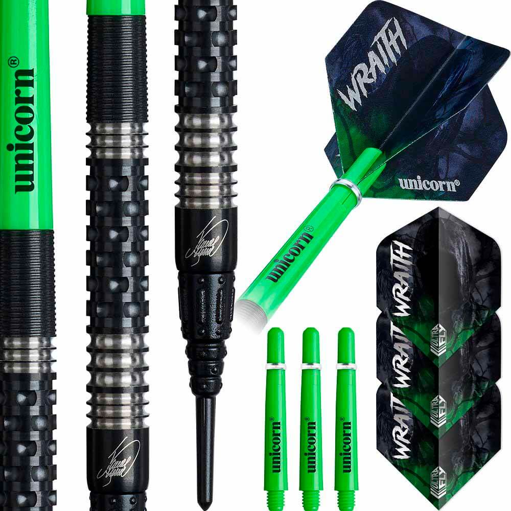 El juego de dardos Unicorn Wraith James Wade Phase 2 se compone por 1 set de 3 cuerpos , 1 set de 3 cañas Unicorn 1 set de 3 plumas y set de 3 puntas 2ba