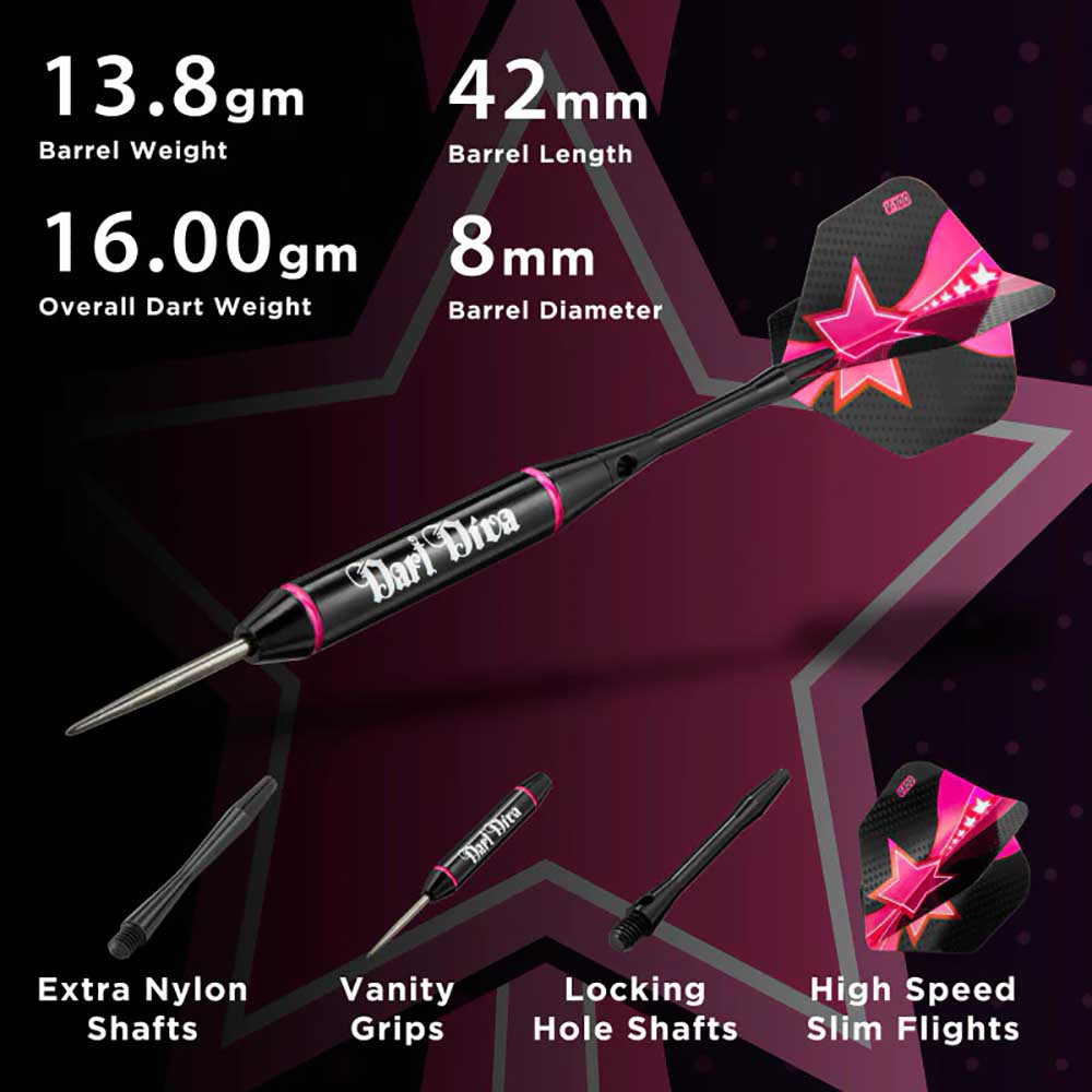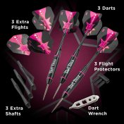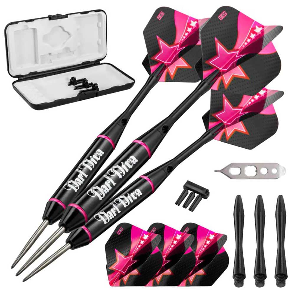 El juego de dardos se compone por 3 cuerpos de dardos Vanity Viper Darts, 6 plumas , 3 cañas de nylon , 3 cañas de aluminio, 1 herramienta de reparación mecánica de dardos, 3 protectores de plumas y un estuche Deluxe Dart Pal con gráficos que combinan con sus dardos. El estuche Deluxe Dart Pal es una excelente solución todo en uno para sus nuevos dardos. Con una carcasa exterior dura y ranuras forradas de tela para mantener su dardo seguro, la funda Deluxe Dart Pal tiene espacio para todo lo que esta incluido en este juego de dardos.