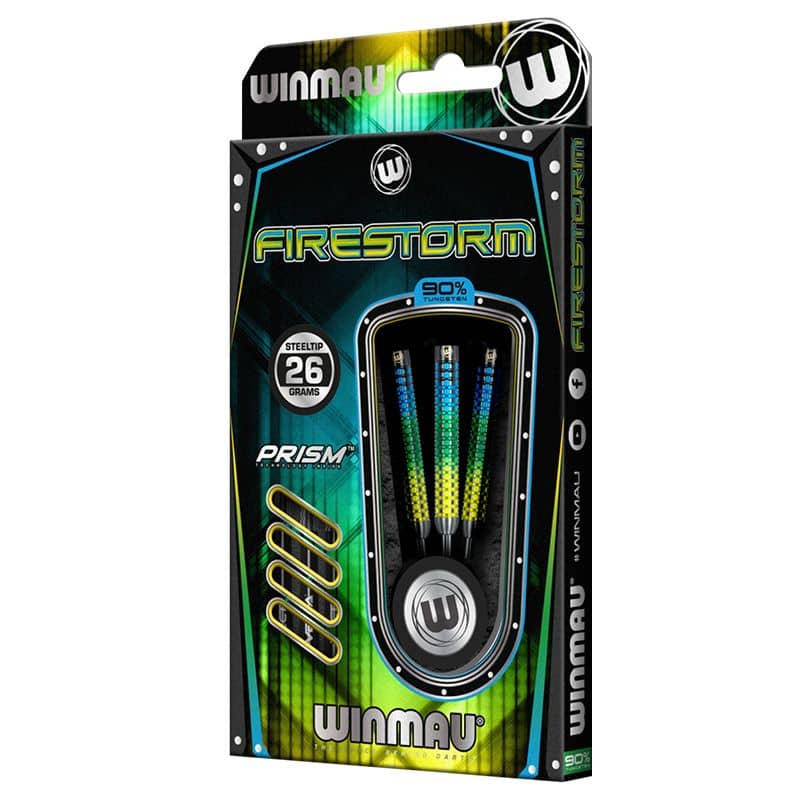 El juego de dardos Winmau Firestorm 26gr se compone por 1 set de 3 cuerpos con punta de metal, 1 set de 3 cañas Vecta Short, 1 set de 3 plumas Prism Alpha y 1 protector de puntas de metal.